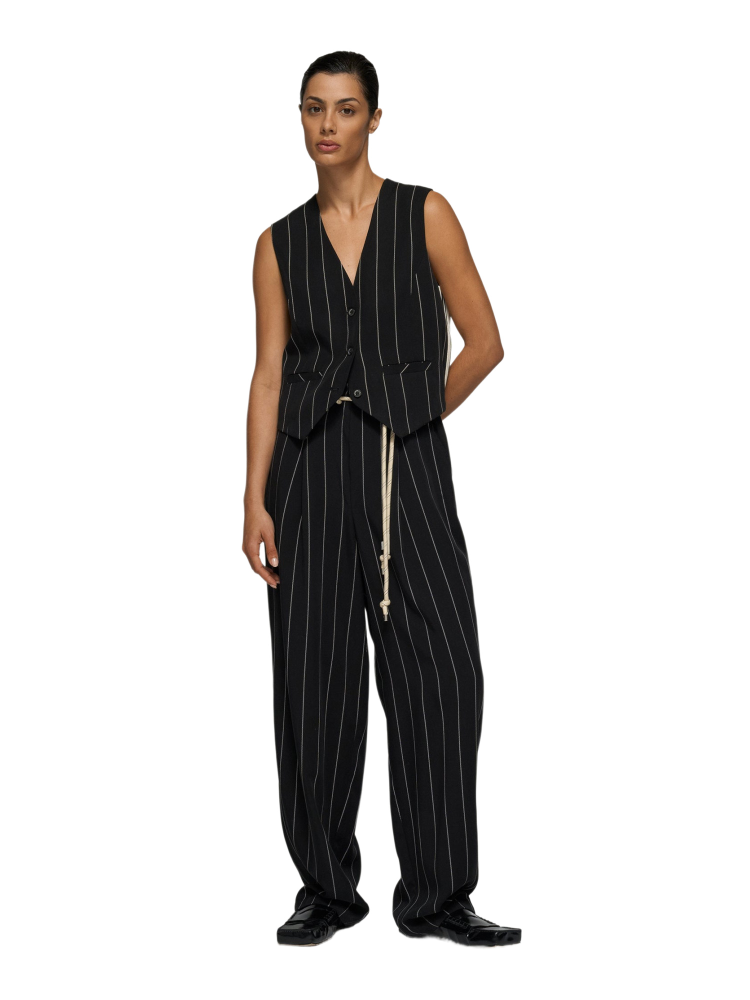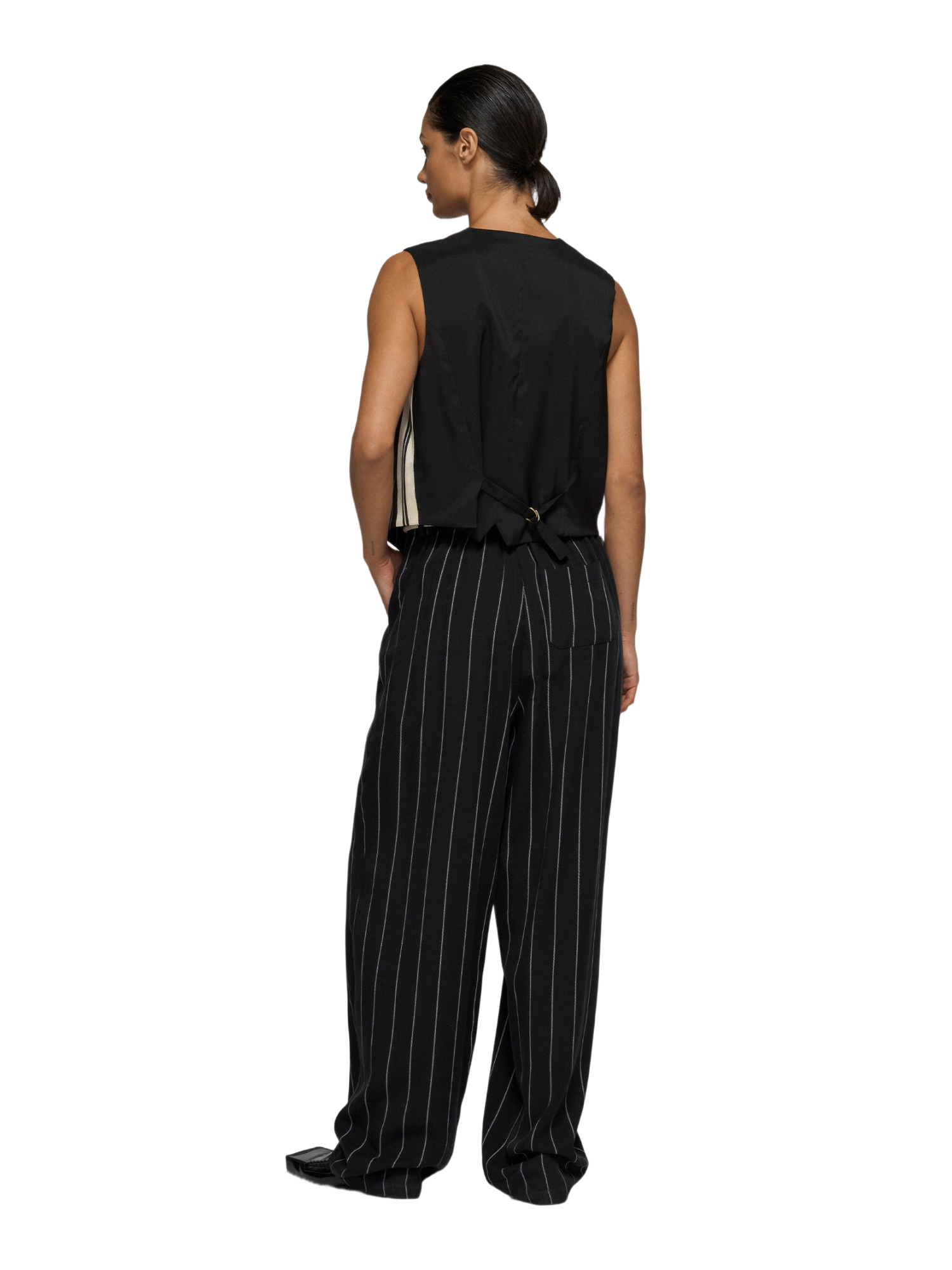 Die Weste zeichnet sich durch einen klassischen V-Ausschnitt und eine ärmellose Gestaltung aus, die Dir Freiheit und Flexibilität bei der Wahl Deiner Outfits gibt. Der praktische Knopfverschluss und die angedeuteten Taschen verleihen einen Hauch von Funktionalität, während der verstellbare Gürtel auf der Rückseite es Dir ermöglicht, die Passform individuell anzupassen. Nicht zu vergessen sind die entlang den Seitennähten verlaufenden Paspeldetails, die einen subtilen, aber wirkungsvollen Akzent setzen.