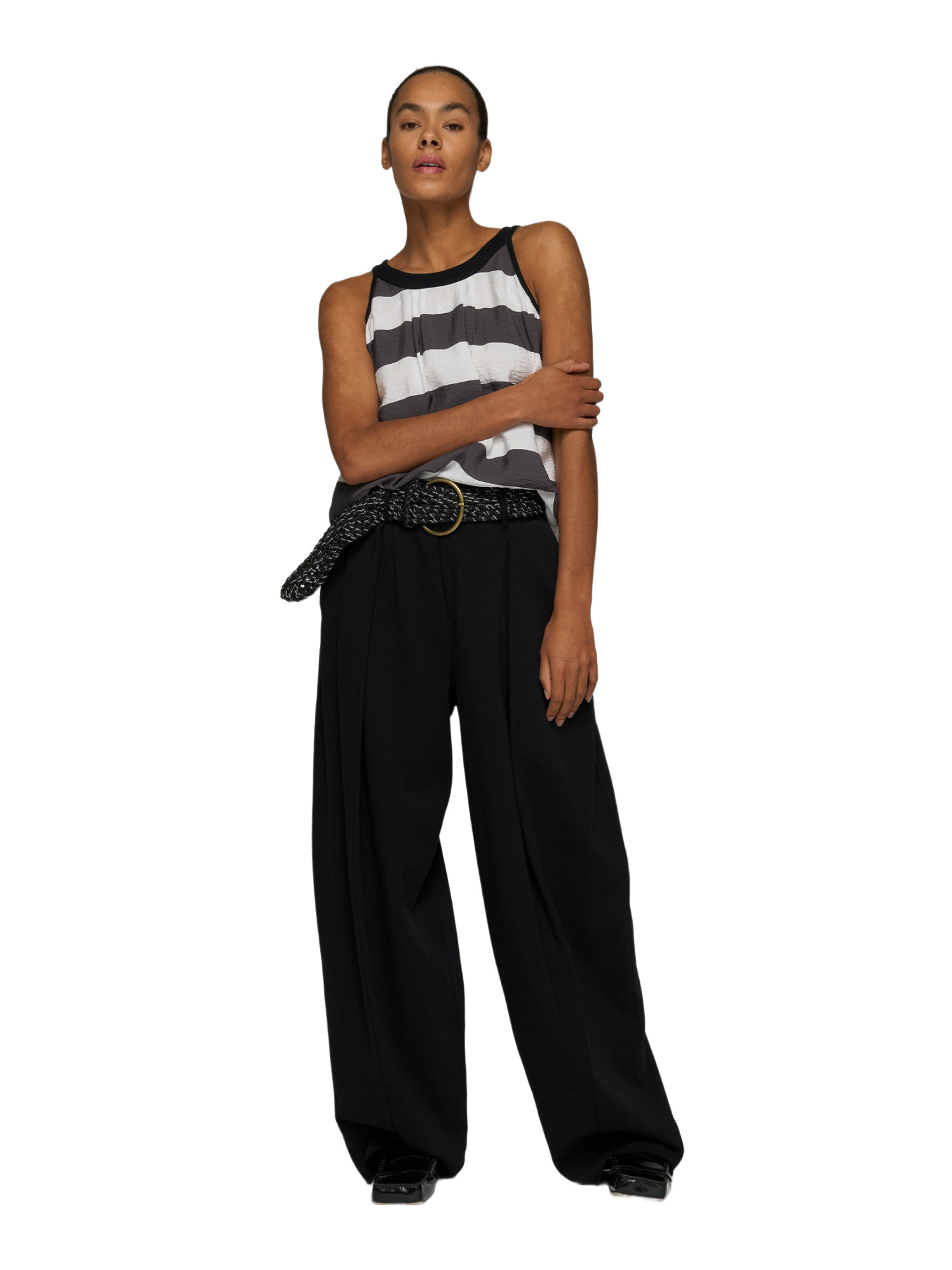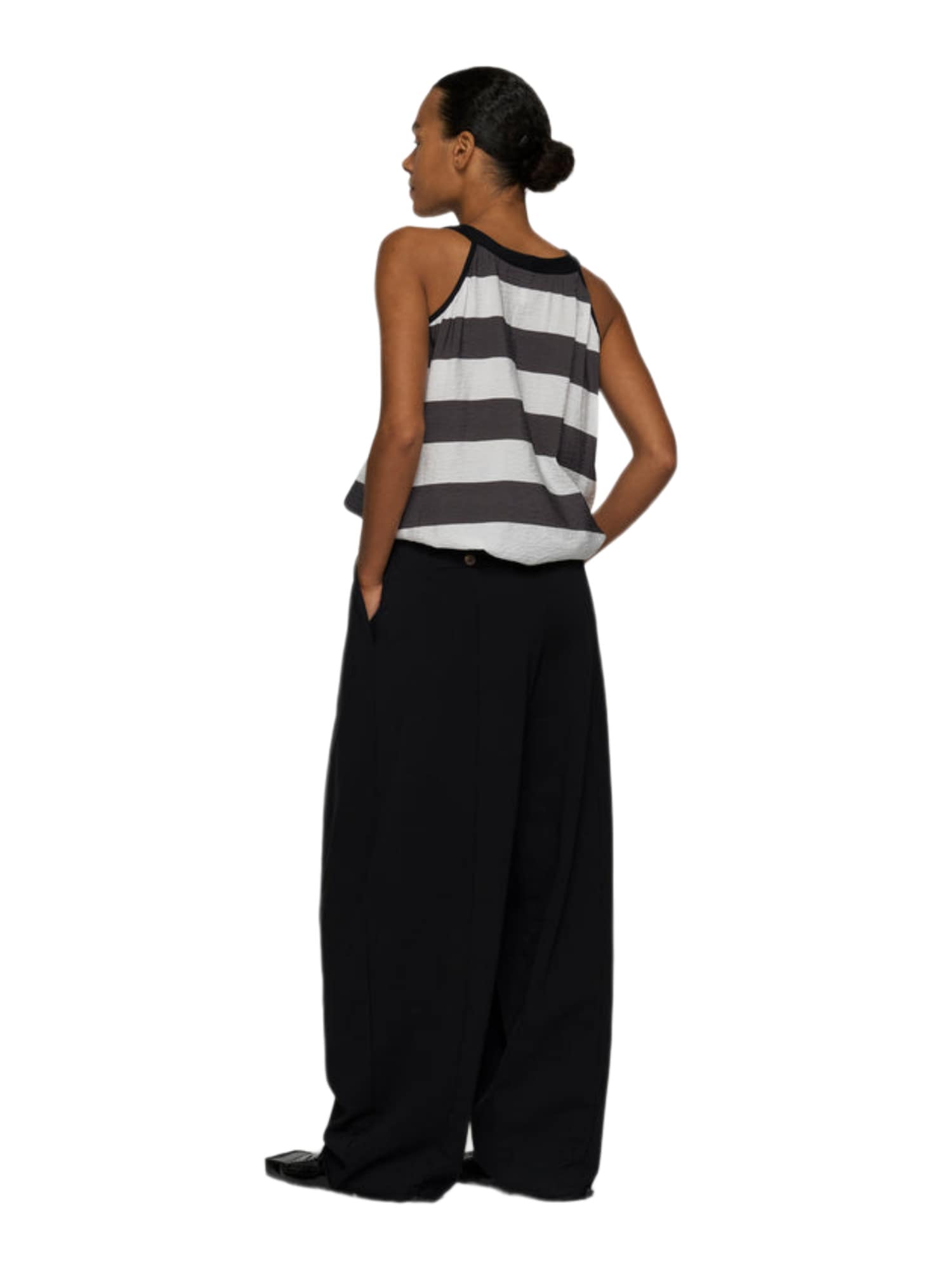 Die Hose zeichnet sich durch liebevolle Details aus, wie die sorgfältig platzierten Falten und die offenen Säume, die dem Design eine moderne, ungezwungene Note verleihen. Der hohe Bund betont zudem vorteilhaft die Taille und unterstützt eine schöne Silhouette.
