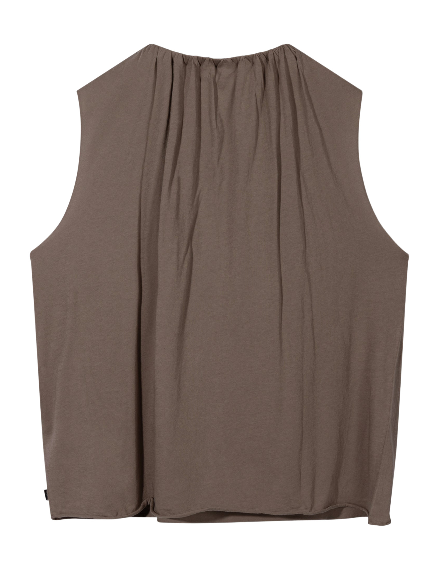 Ob für einen entspannten Tag zu Hause, einen Stadtbummel oder ein lässiges Treffen mit Freunden – dieses Top passt sich jeder Situation an. Der elastische, gesmokte Rundhalsausschnitt sorgt für eine bequeme Passform, während die ungesäumten Abschlüsse an den Armausschnitten und am Saum dem Top einen modernen, leicht unkonventionellen Look verleihen.