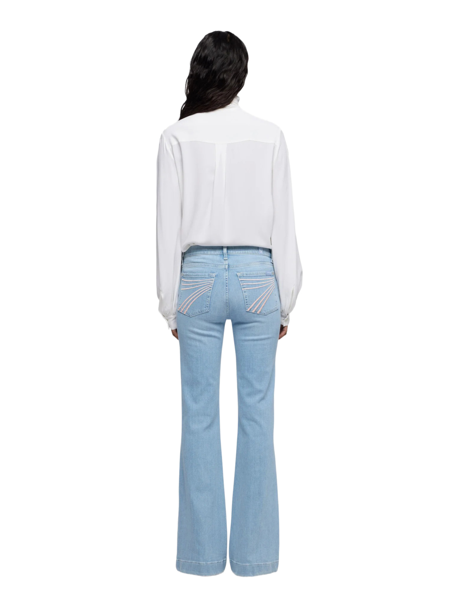 Von der hellen Waschung mit subtilem Whisker- und Bleicheffekt bis hin zur charakteristischen 7-Stickerei auf den Gesäßtaschen – diese Jeans steckt voller liebevoller Details, die sie zu einem echten Hingucker machen. Die tonalen Nähte und der klassische Reißverschluss- und Knopfverschluss runden das Design stilvoll ab.