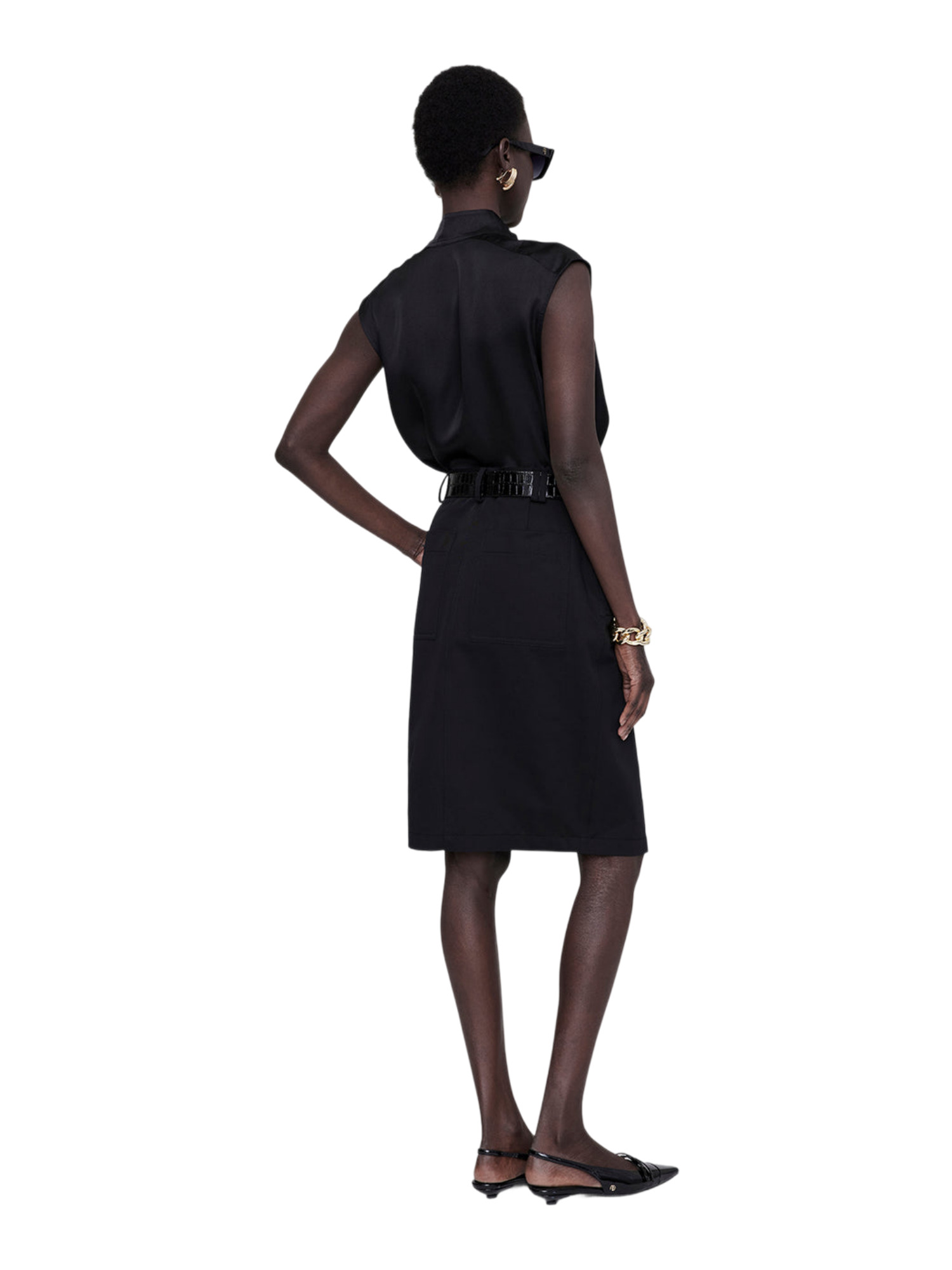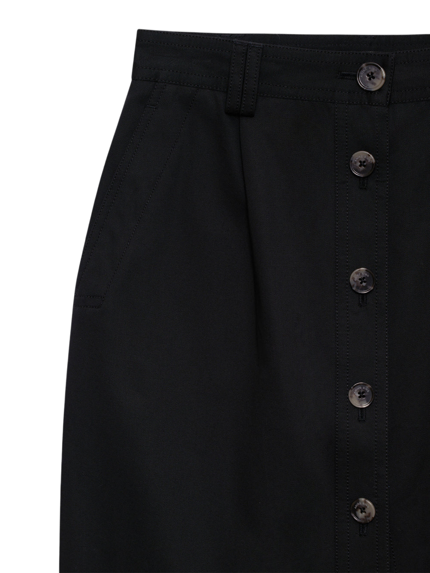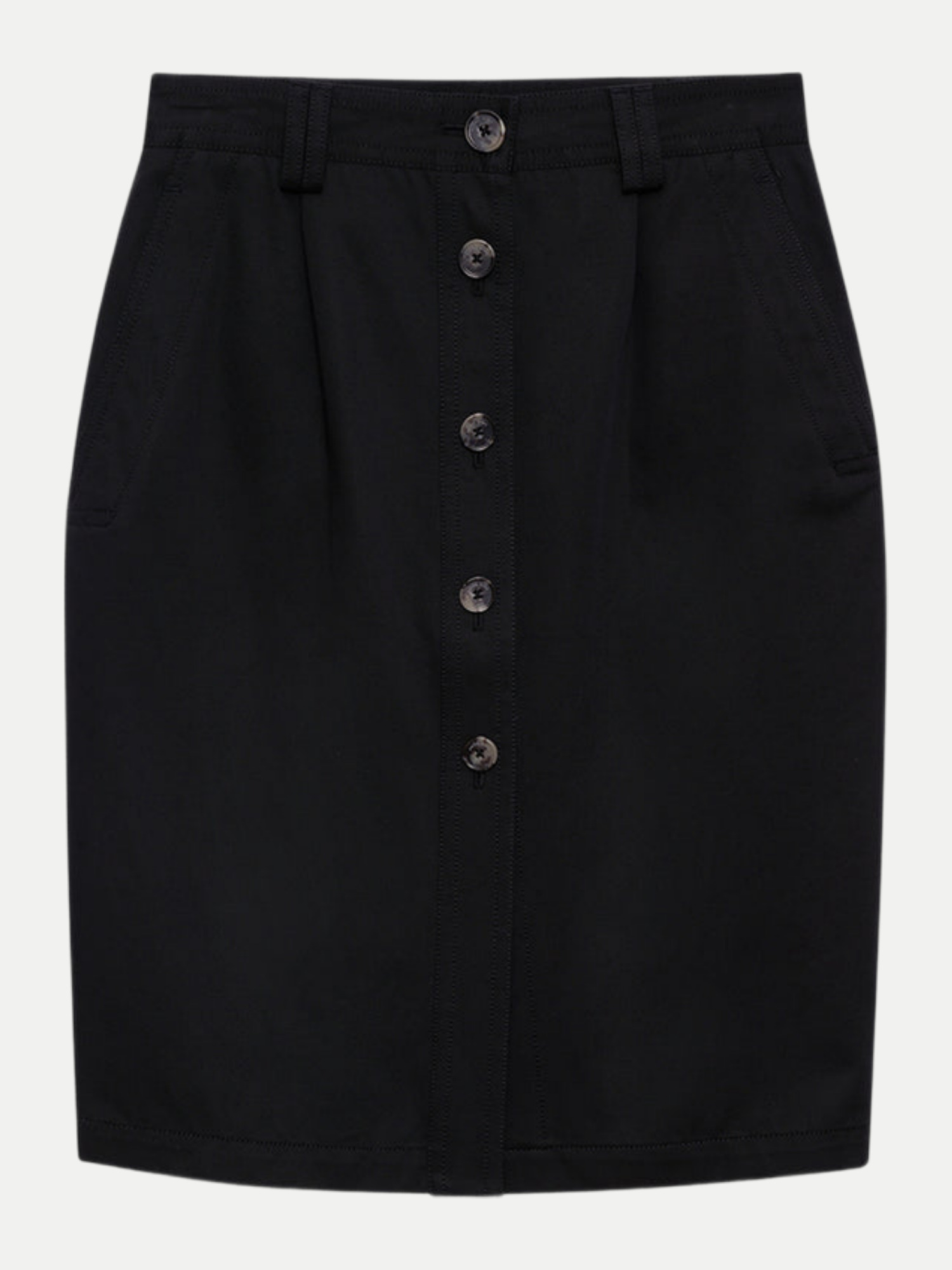 Die sichtbare Knopfleiste in der Mitte vorne verleiht dem Rock einen einzigartigen Touch, während die doppelten Gürtelschlaufen und Seitennahttaschen praktisch und stilvoll zugleich sind. Zwei aufgesetzte Taschen hinten sowie durchgehende Steppnähte runden das Design ab und machen den Rock zu einem echten Hingucker.