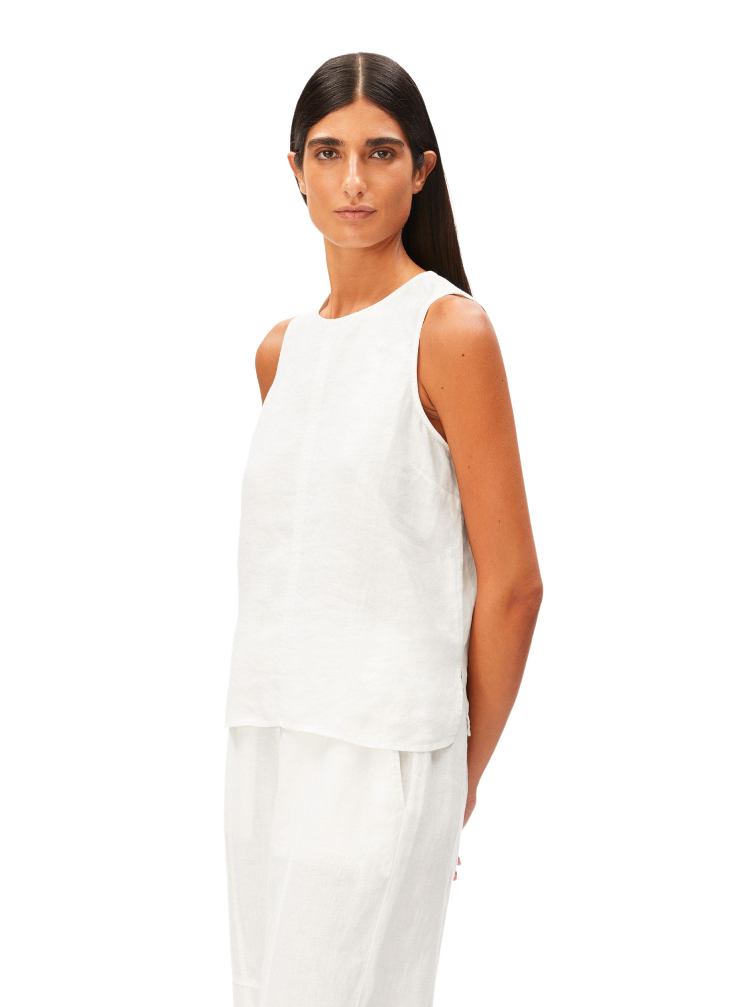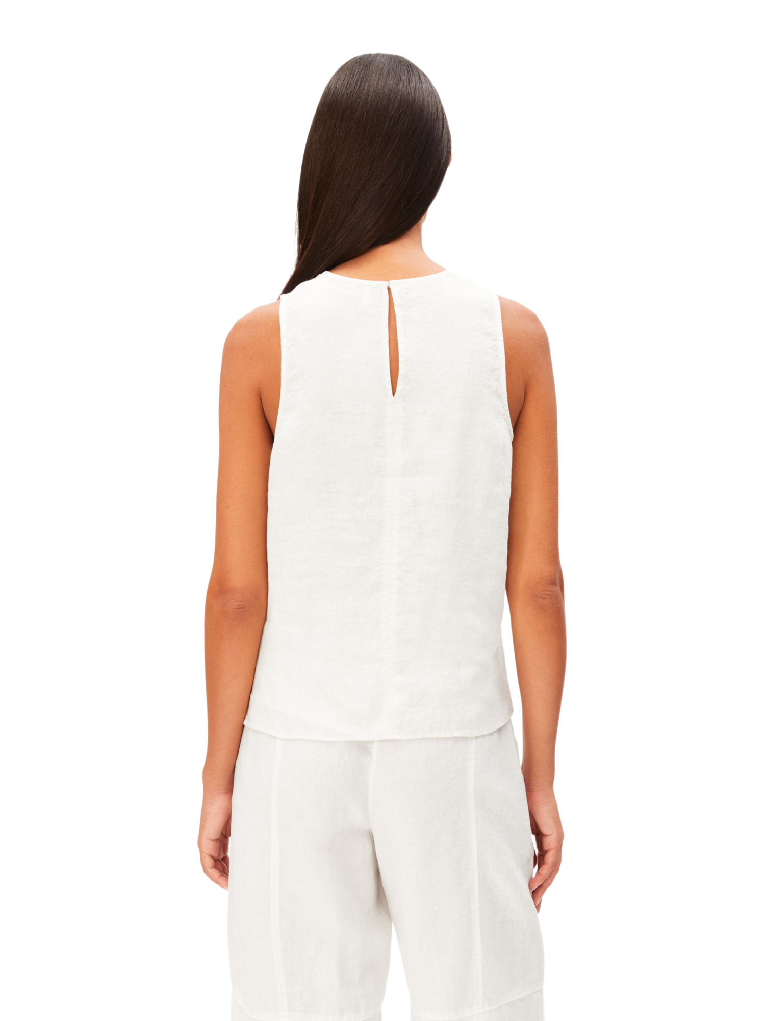 Dieses ärmellose Top ist ideal für warme Tage. Der luftige Leinenstoff fühlt sich auf der Haut angenehm kühl an und sorgt dafür, dass Du Dich den ganzen Tag über frisch fühlst. Der Rundhalsausschnitt verleiht dem Top eine klassische Note, während der geknotete Verschluss am Rücken einen modernen Twist bietet.