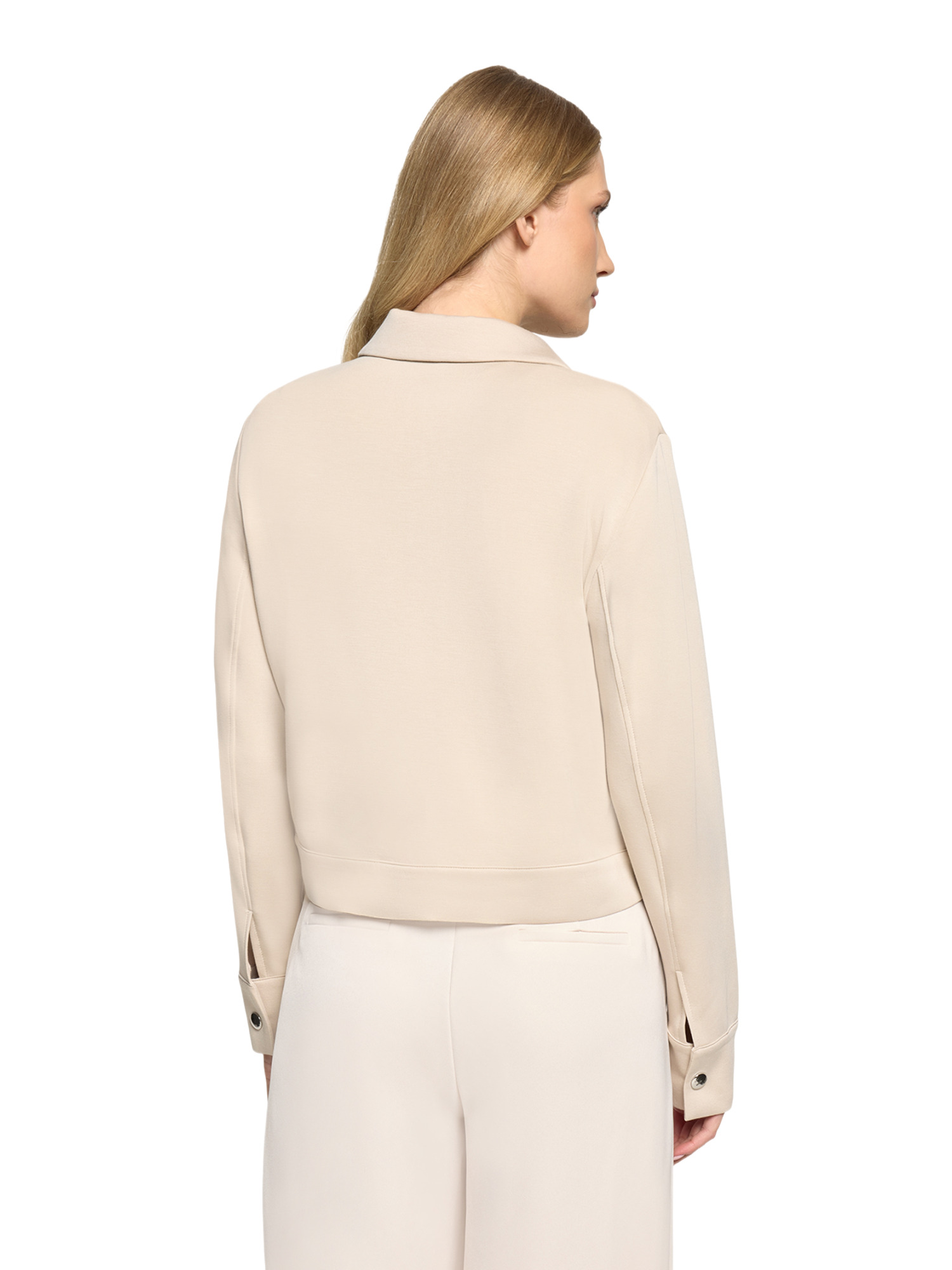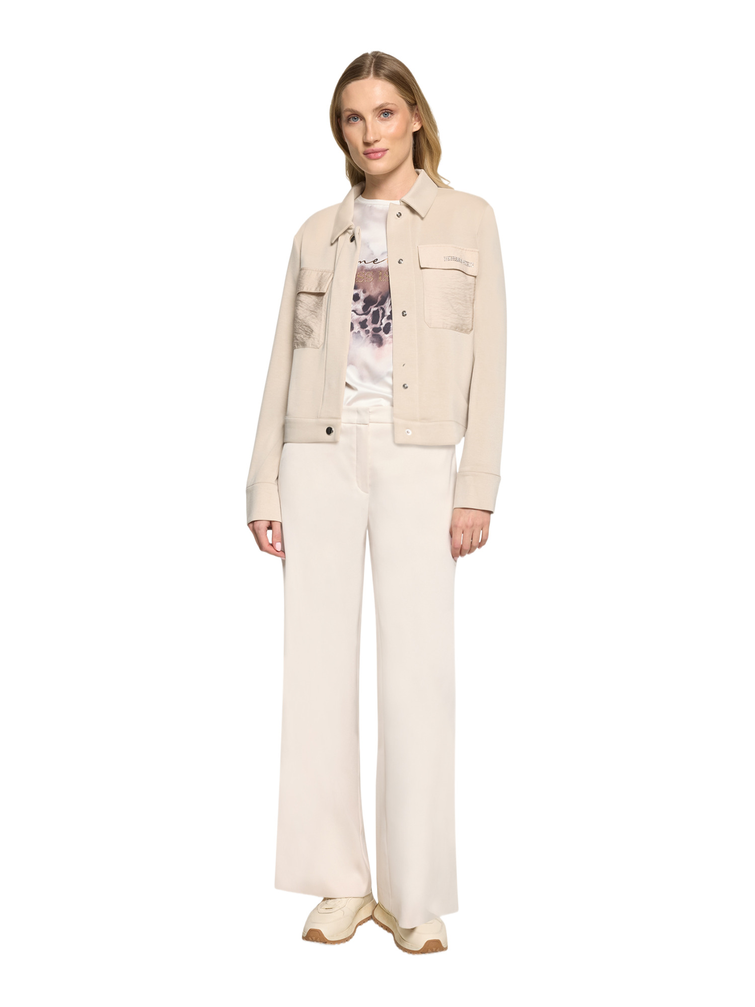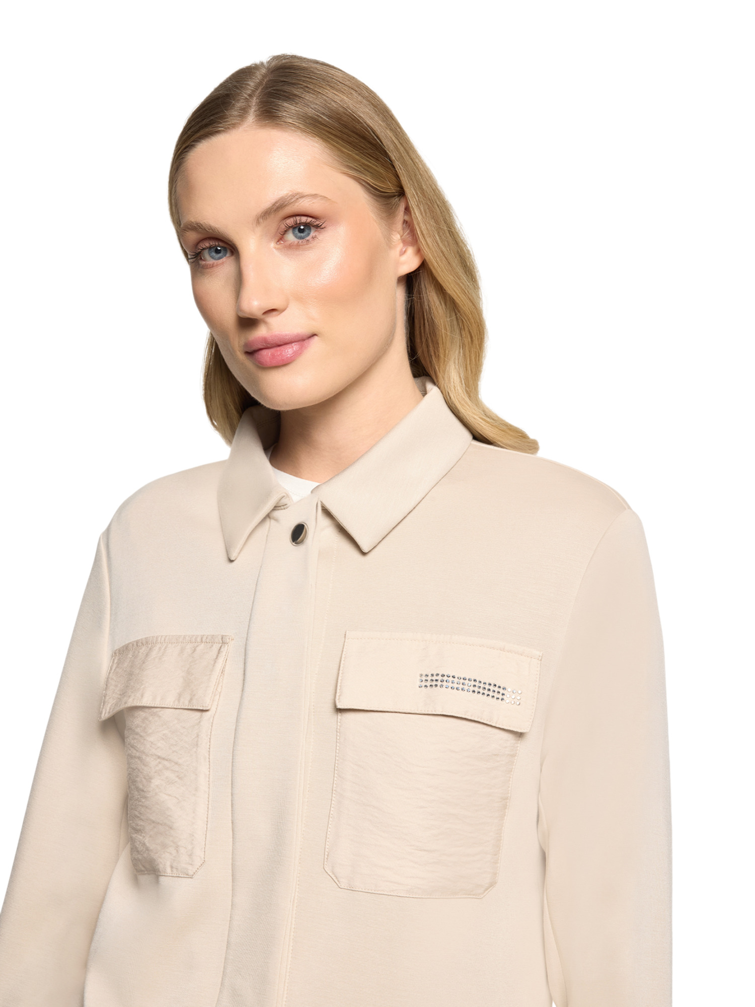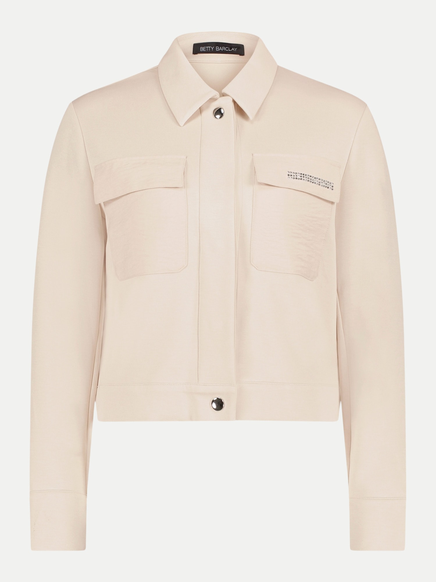Die aufgesetzten Brusttaschen sind nicht nur praktisch, sondern auch ein stylisches Detail, das dem Blazer einen modernen Touch verleiht. Mit langen Ärmeln und einem sorgfältig gestalteten Hemdkragen kombiniert dieser Blazer traditionelle Elemente mit zeitgemäßem Design. Der verdeckte Verschluss mit Druckknopf sorgt für eine nahtlose Front, die das minimalistische Design unterstreicht.