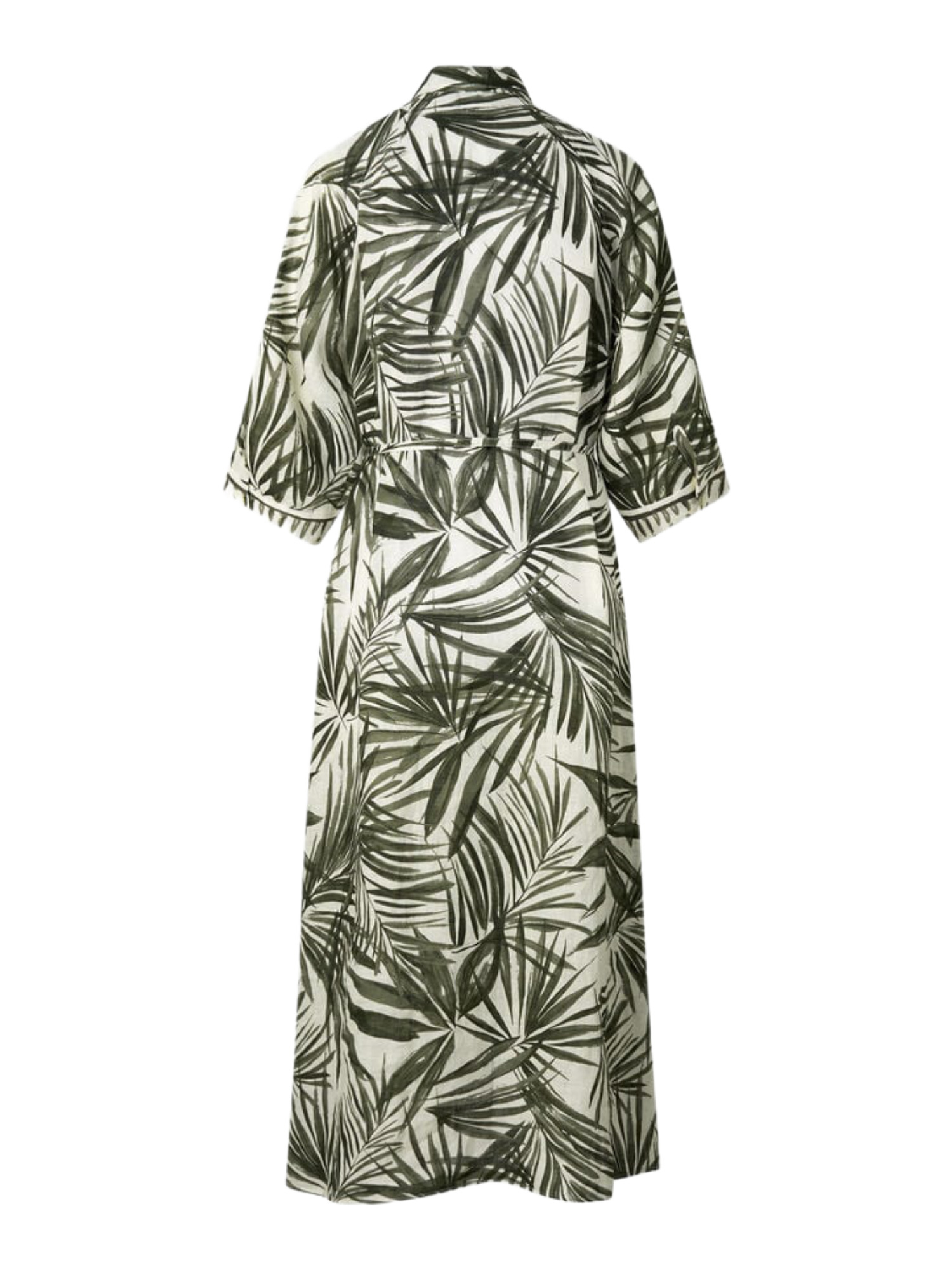 Das CATELYN Kleid ist aus 100% reinem Leinen gefertigt, was es besonders atmungsaktiv und angenehm zu tragen macht. Die Maxi-Länge schmeichelt jeder Figur und bietet zugleich einen eleganten, fließenden Look. Der moderne Palmen-Print verleiht dem Kleid eine frische und lebendige Ausstrahlung, perfekt für die warmen Tage.