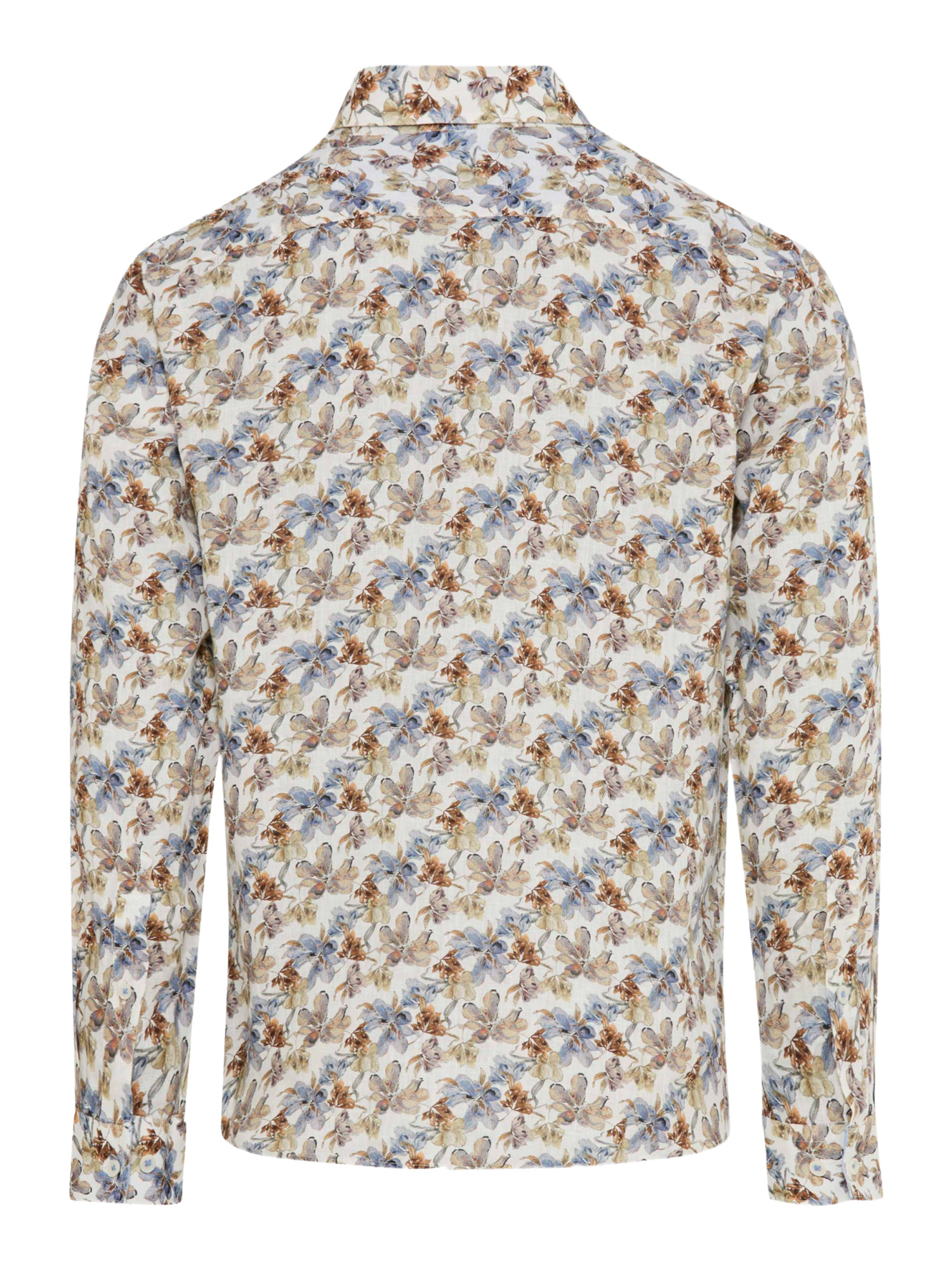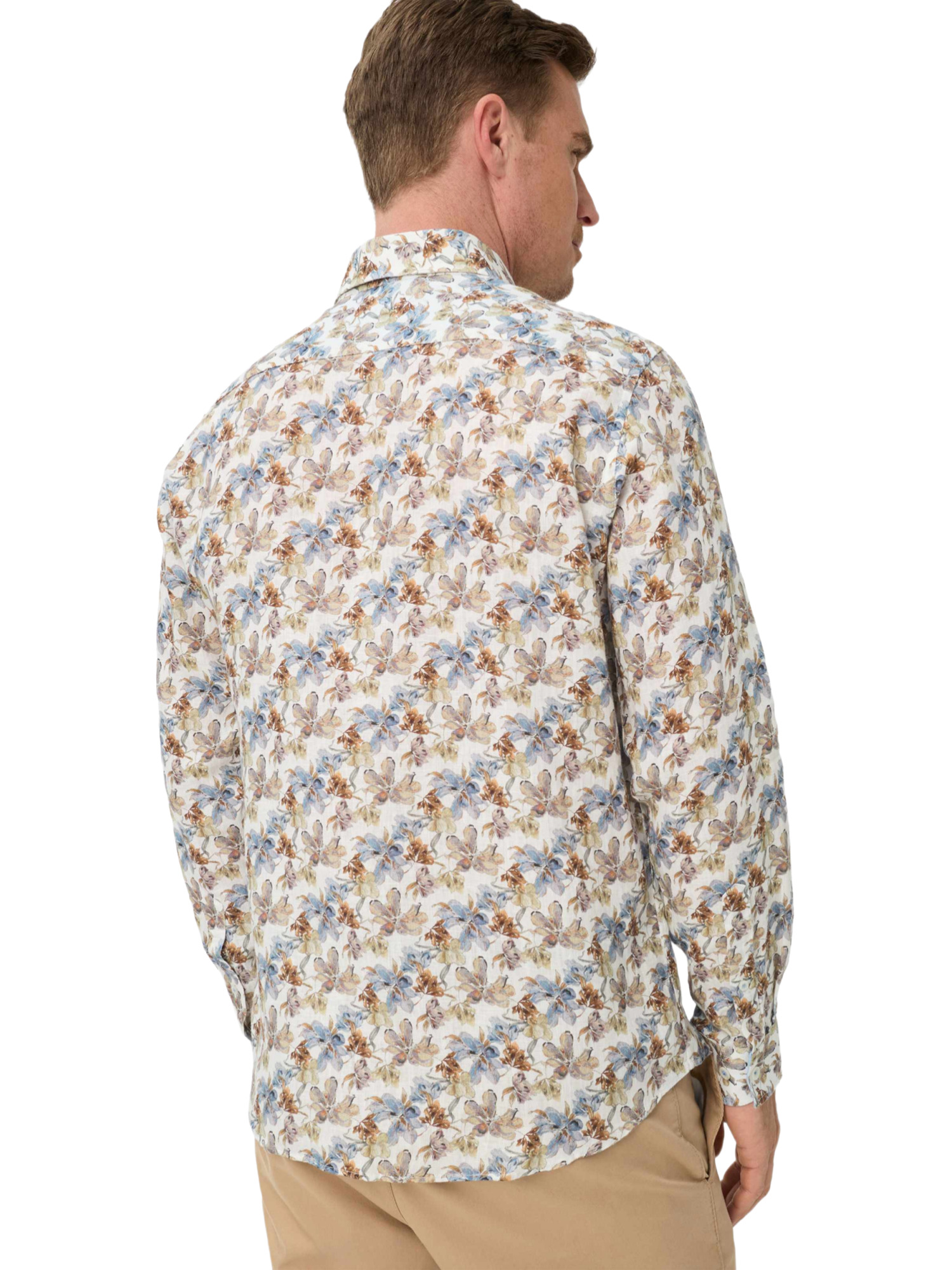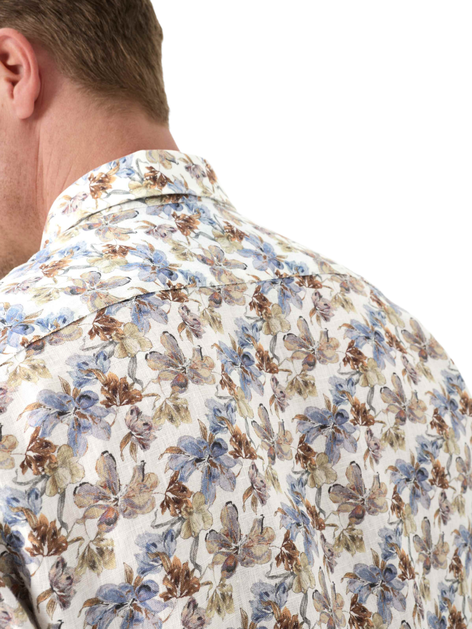 Das feine, florale Allover-Muster des Hemdes strahlt eine elegante Lebendigkeit aus, ohne dabei zu aufdringlich zu wirken. Kombiniere es mit einer hellen Chino oder einer Leinenhose für einen ausgefeilten Look oder trage es locker über Shorts für einen entspannten Nachmittag im Park. Der klassische Haifischkragen und die schmale Knopfleiste fügen eine gepflegte Note hinzu, während die gerade Passform und die langen Ärmel mit schmalen Manschetten für eine entspannte Silhouette sorgen.