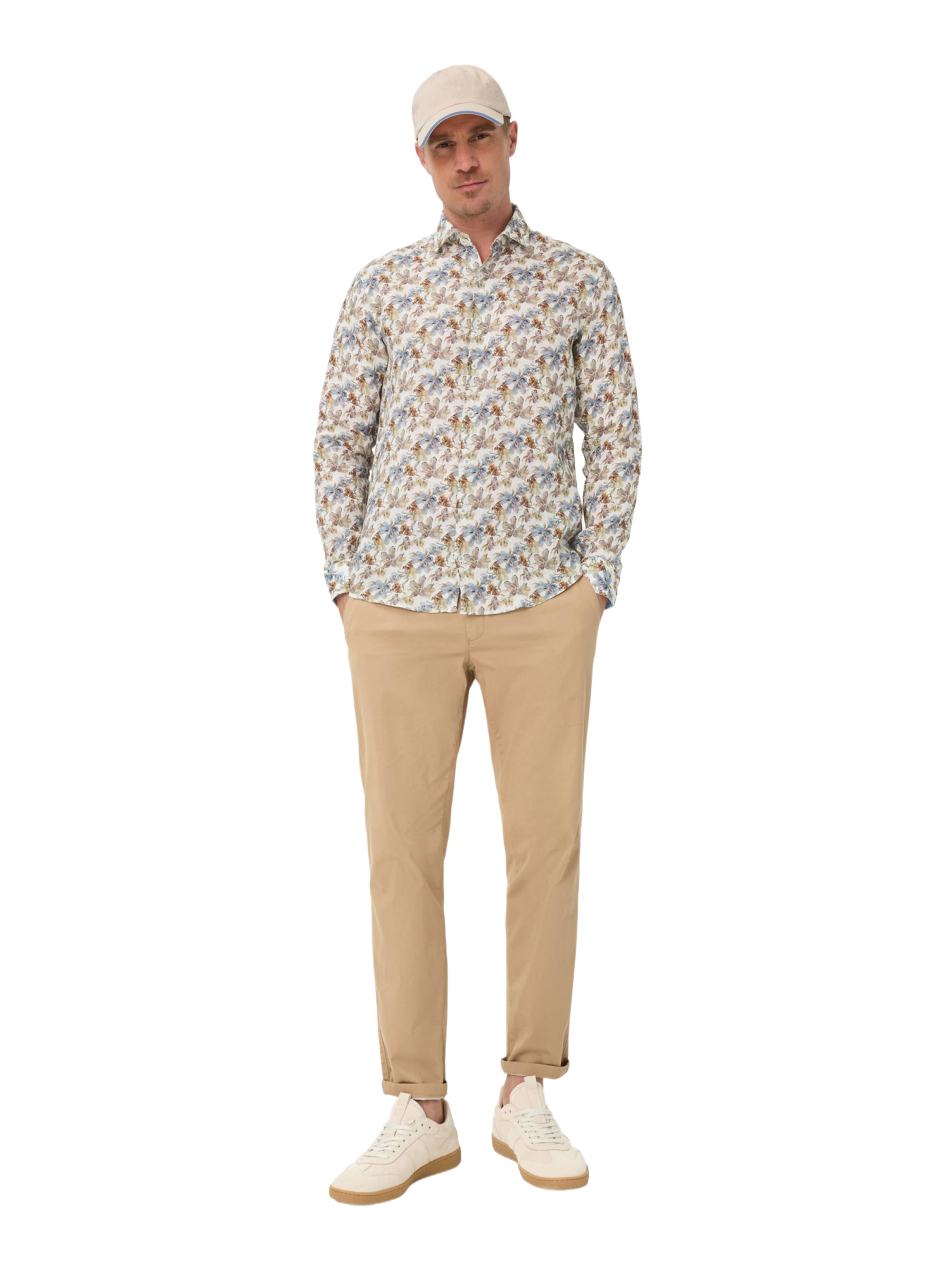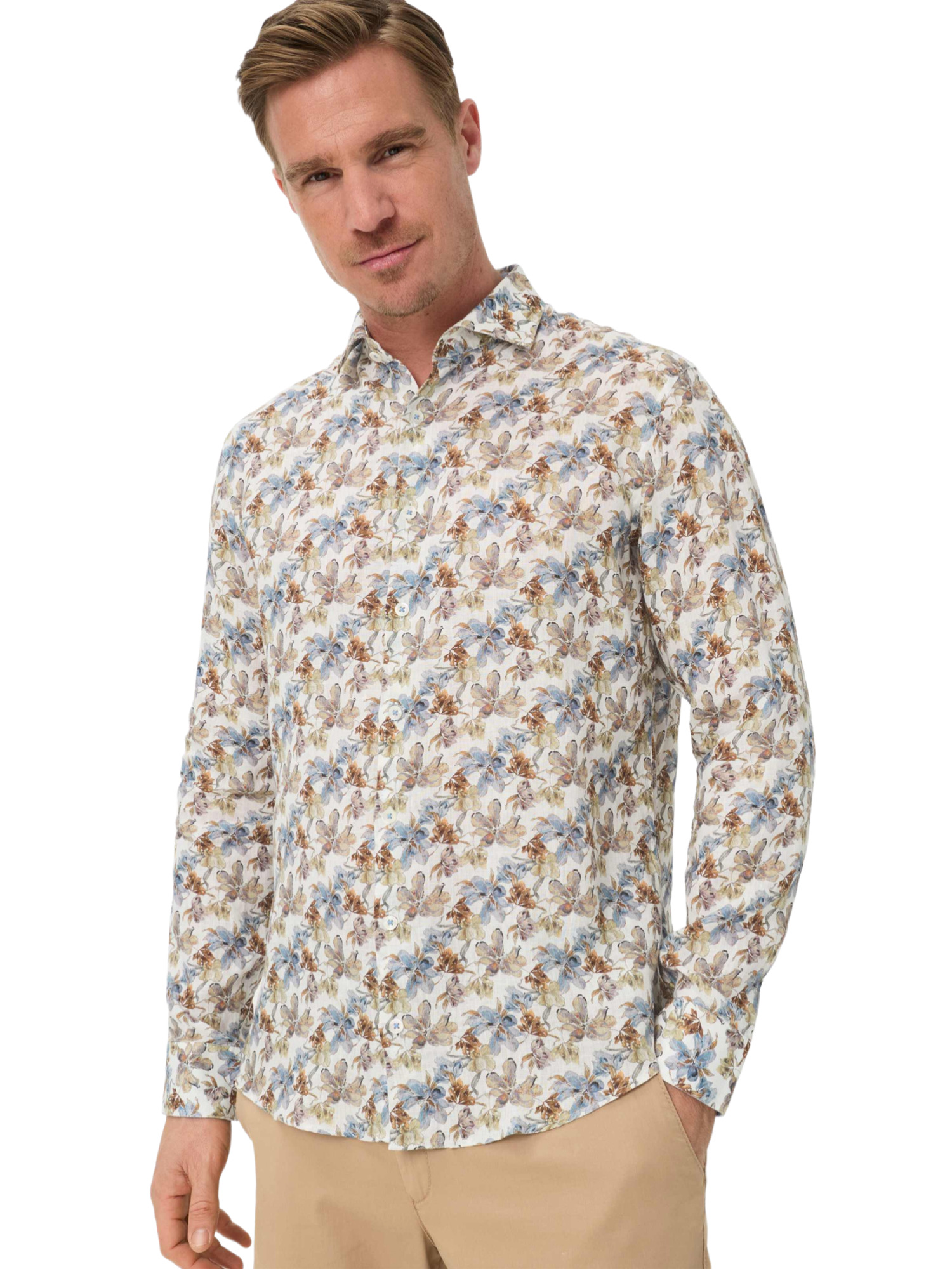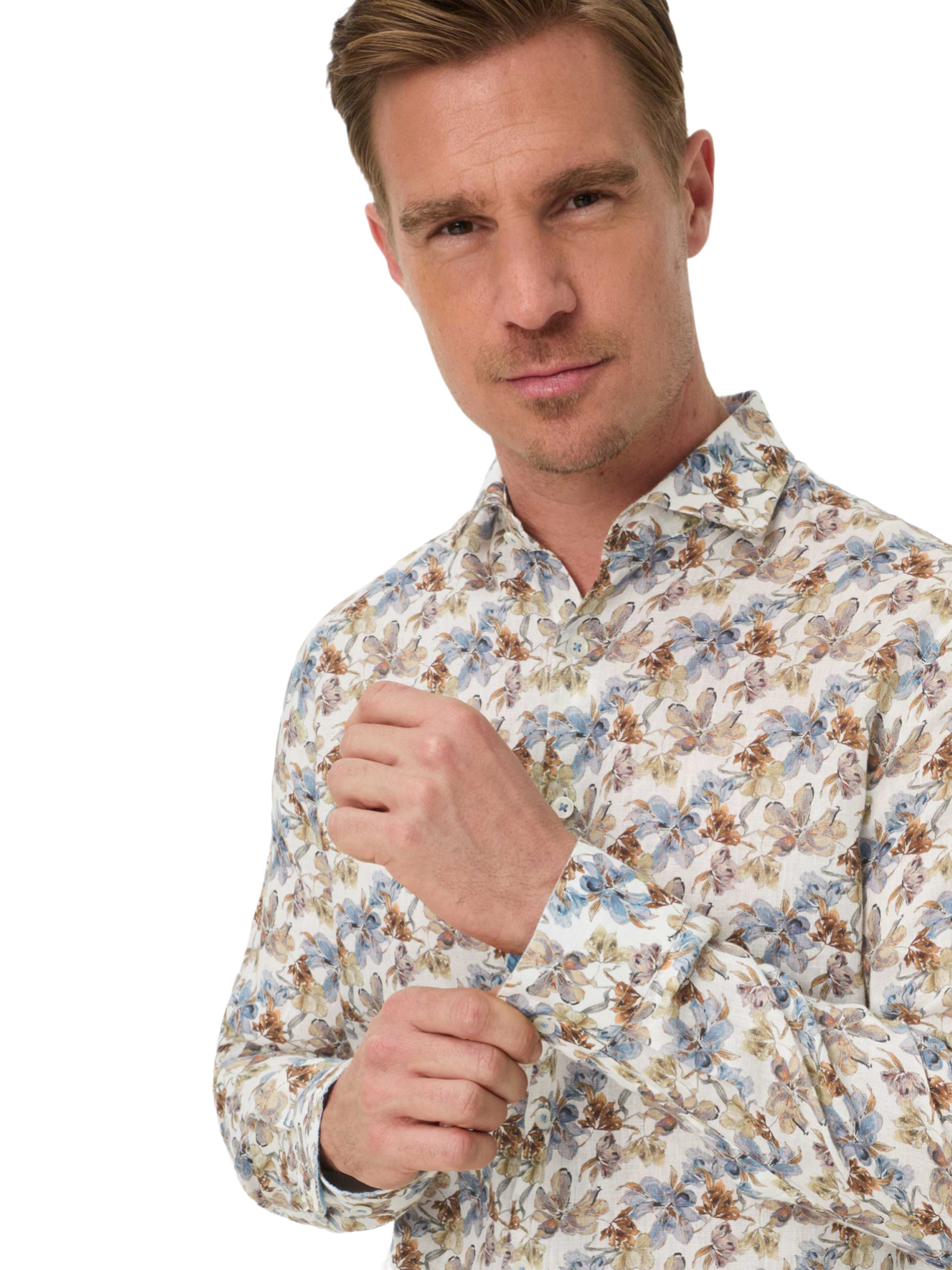 Das feine, florale Allover-Muster des Hemdes strahlt eine elegante Lebendigkeit aus, ohne dabei zu aufdringlich zu wirken. Kombiniere es mit einer hellen Chino oder einer Leinenhose für einen ausgefeilten Look oder trage es locker über Shorts für einen entspannten Nachmittag im Park. Der klassische Haifischkragen und die schmale Knopfleiste fügen eine gepflegte Note hinzu, während die gerade Passform und die langen Ärmel mit schmalen Manschetten für eine entspannte Silhouette sorgen.