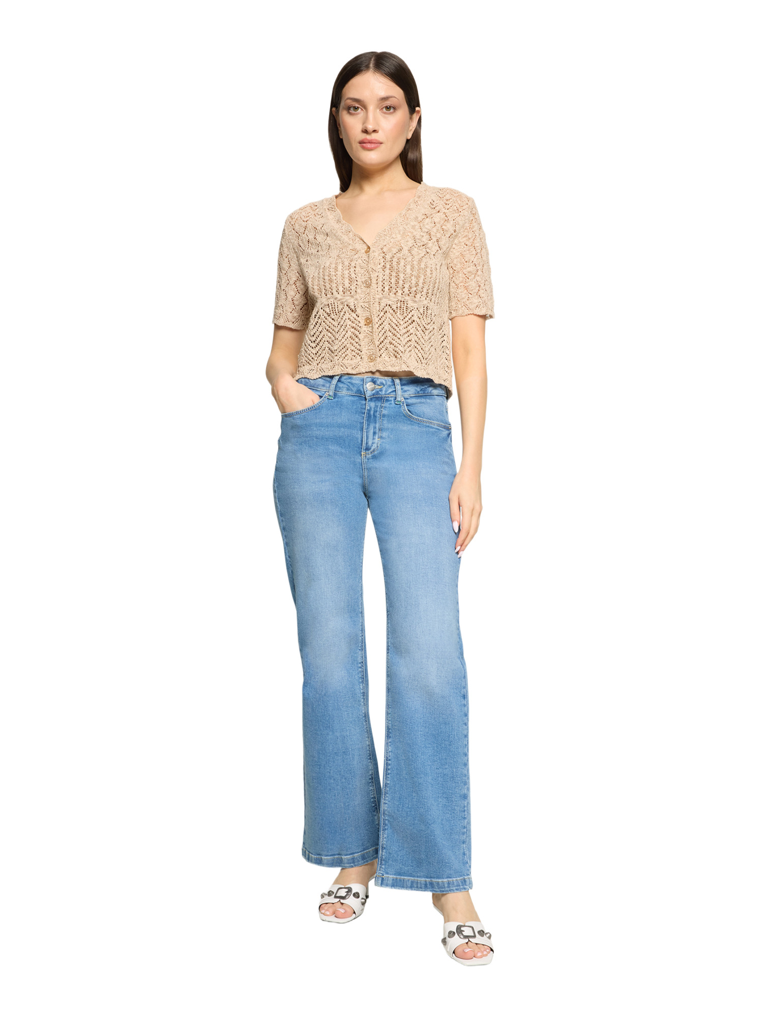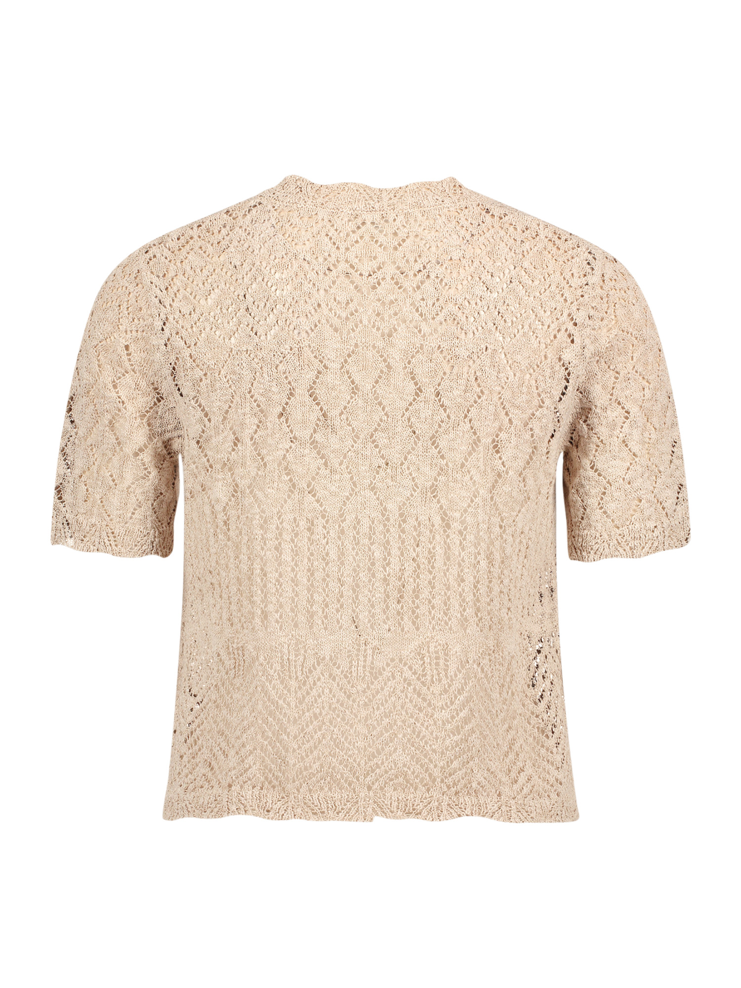 Der feine V-Ausschnitt und die kurzen Ärmel verleihen der Jacke eine sommerliche Leichtigkeit. Besonders hervorzuheben ist das Ajourmuster, das dem Stück eine luftige und zugleich elegante Note verleiht. Geschlossen wird die Jacke mit einer durchgehenden Knopfleiste, die nicht nur praktisch ist, sondern auch stilistisch punktet.