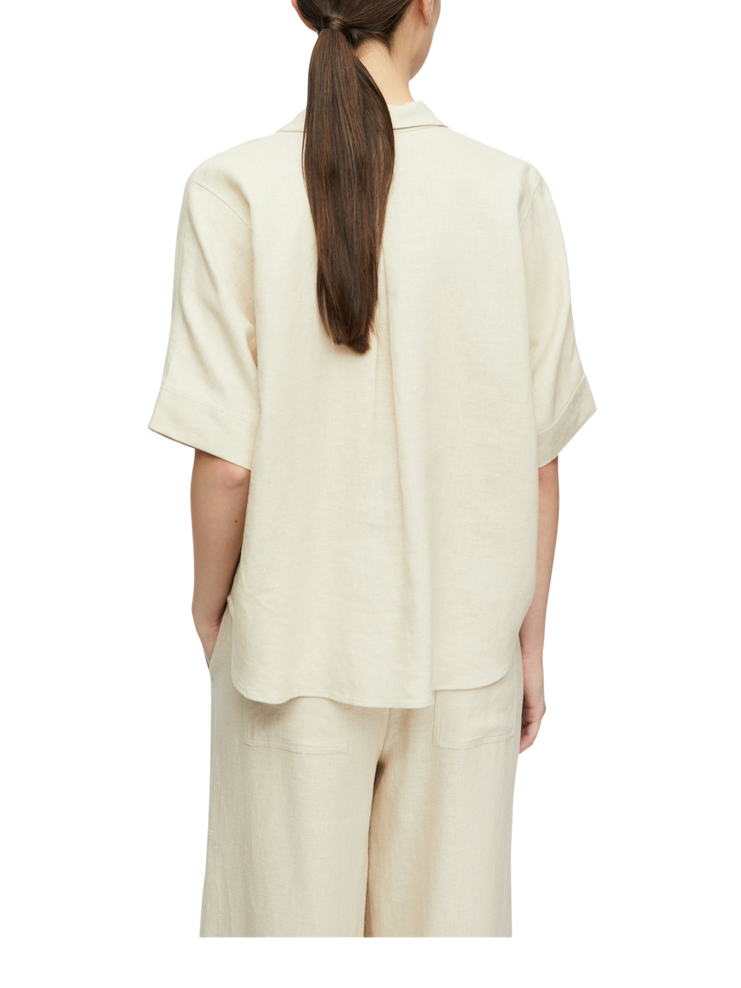 Die Bluse ist aus einer angenehmen Mischung aus 55% Leinen und 45% Lyocell gefertigt, was sie besonders atmungsaktiv und weich auf der Haut macht. Ideal für warme Tage oder fürs Büro, wo Du cool bleiben möchtest.