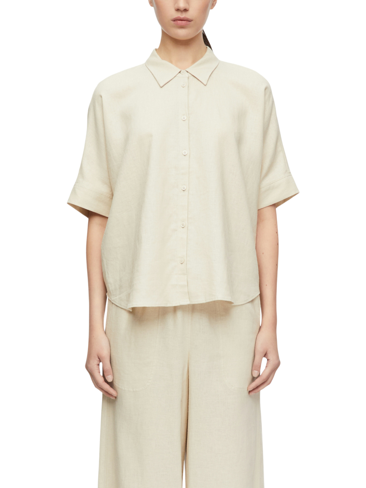 Die Fledermausärmel verleihen dieser Bluse einen modernen Touch und sorgen für eine lässige, fließende Passform. Der Hemdblusenkragen und die durchgehende Knopfleiste verleihen ihr einen klassischen Look, der nie aus der Mode kommt. Der abgerundete Saum rundet das Design stilvoll ab und macht die Bluse vielseitig kombinierbar – ob über der Jeans getragen oder in den Bund gesteckt.