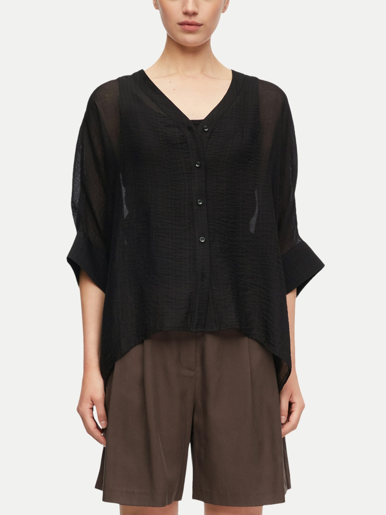 Das Design der Bluse spricht für sich: Ein eleganter V-Ausschnitt und eine durchgehende Knopfleiste verleihen ihr einen Hauch von Klassik, während der hinten länger geschnittene Saum moderne Akzente setzt. Die 3/4 Ärmel runden das Gesamtbild perfekt ab und machen die Bluse zu einem idealen Begleiter für jede Jahreszeit.