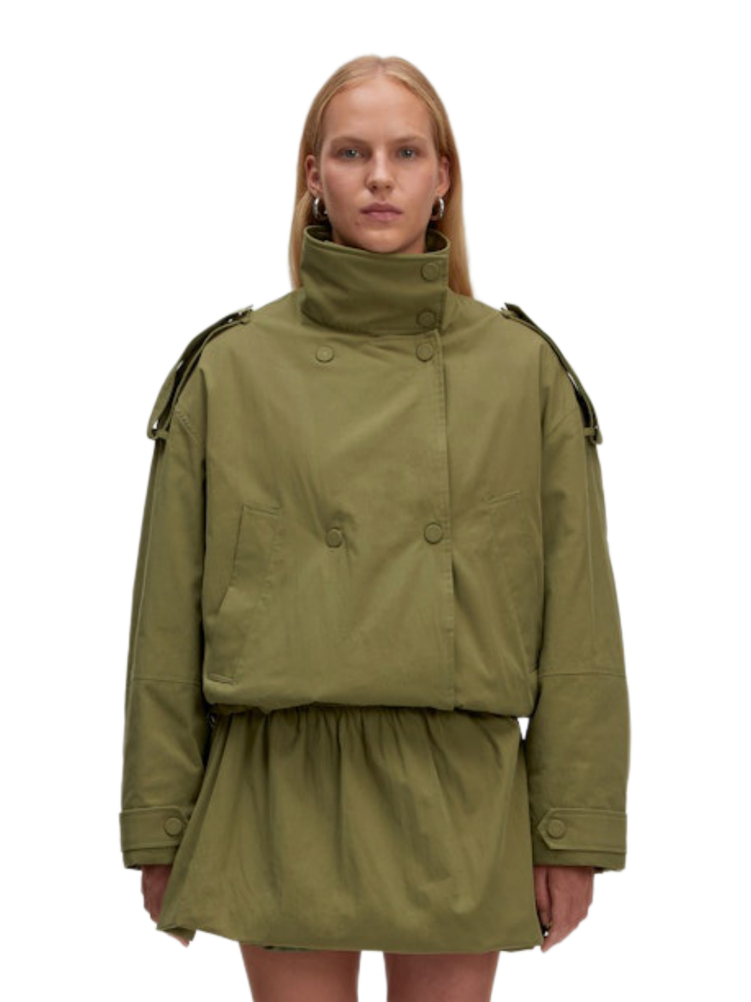 Die Jacke Agatha ist aus einer hochwertigen Mischung aus 70% Baumwolle und 30% Polyester gefertigt, was sie besonders angenehm zu tragen macht. Das Futter aus 100% recyceltem Polyester sorgt für zusätzliche Wärme und Komfort. Der Stehkragen schützt deinen Hals an windigen Tagen, während die langen Ärmel dafür sorgen, dass keine Kälte unter die Jacke schlüpft.