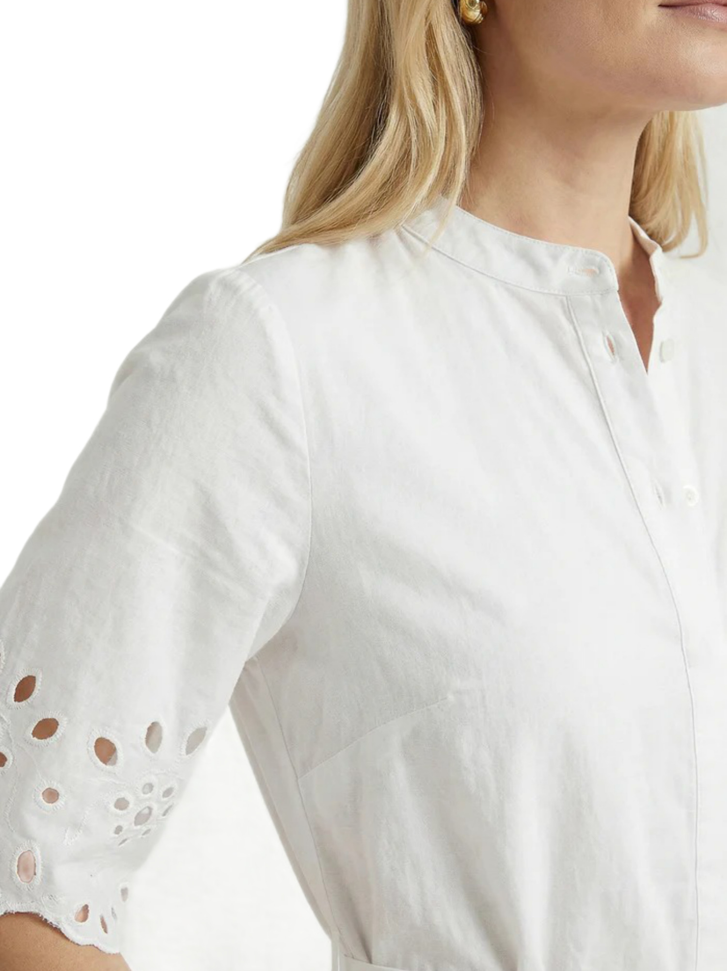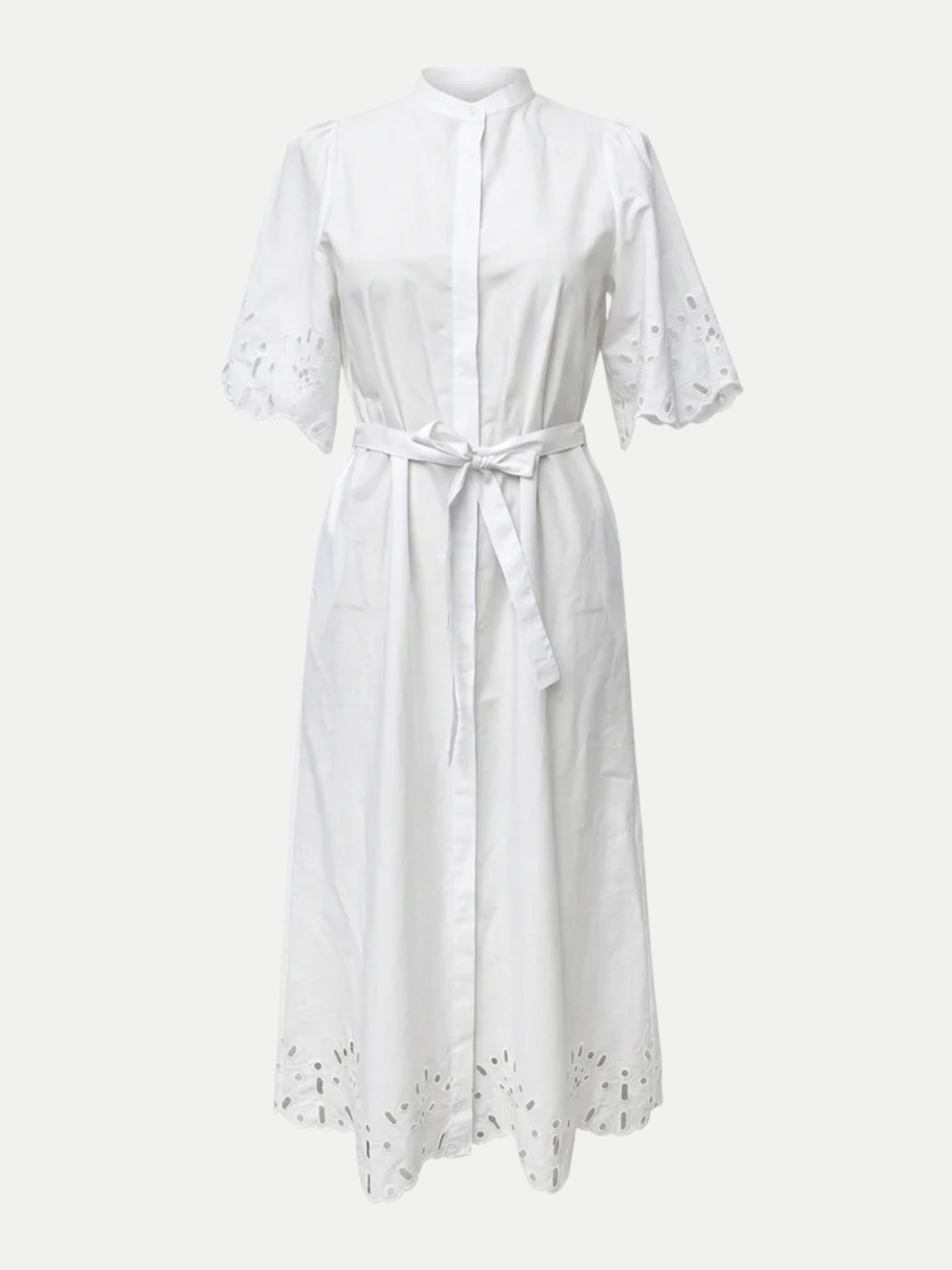 Die Lochmuster verleihen dem Kleid eine verspielte Note, während die Knopfleiste und der Stehkragen einen Hauch von formeller Eleganz hinzufügen. Mit dem Taillengürtel kannst Du Deine Figur wunderbar betonen und das Kleid nach Belieben anpassen. Die Möglichkeit, das Kleid vorne zu binden, bietet Dir zudem eine zusätzliche stilistische Variante.