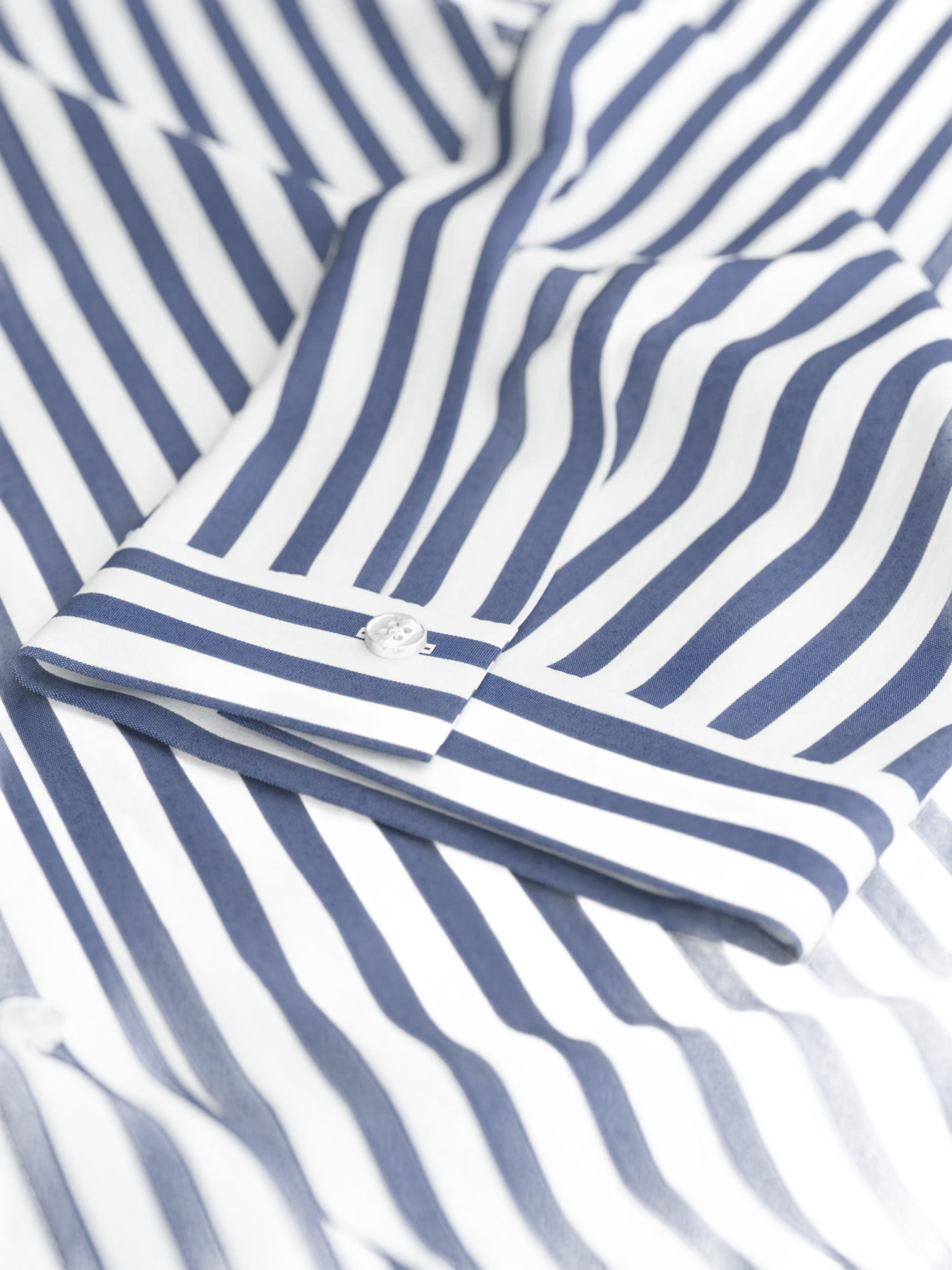 Das gestreifte Muster des Blusenkleids Dominique ist subtil und doch präsent, was das Kleid vielseitig kombinierbar macht. Trage es mit Sneakers für einen entspannten Look oder schlüpfe in Pumps, um es bürotauglich zu machen. Der cleane Saumabschluss mit kurzen Seitenschlitzen rundet das Design stilvoll ab.