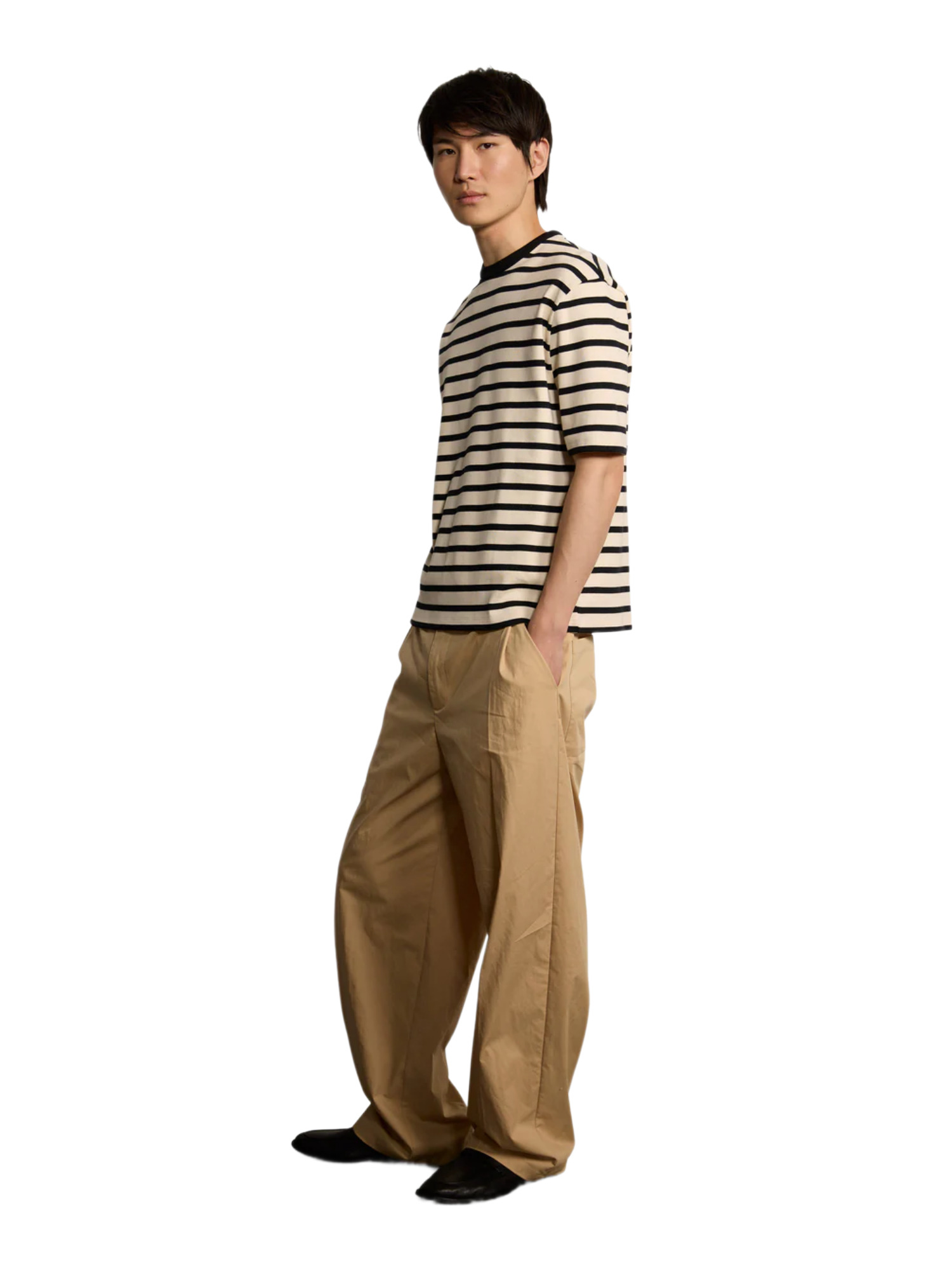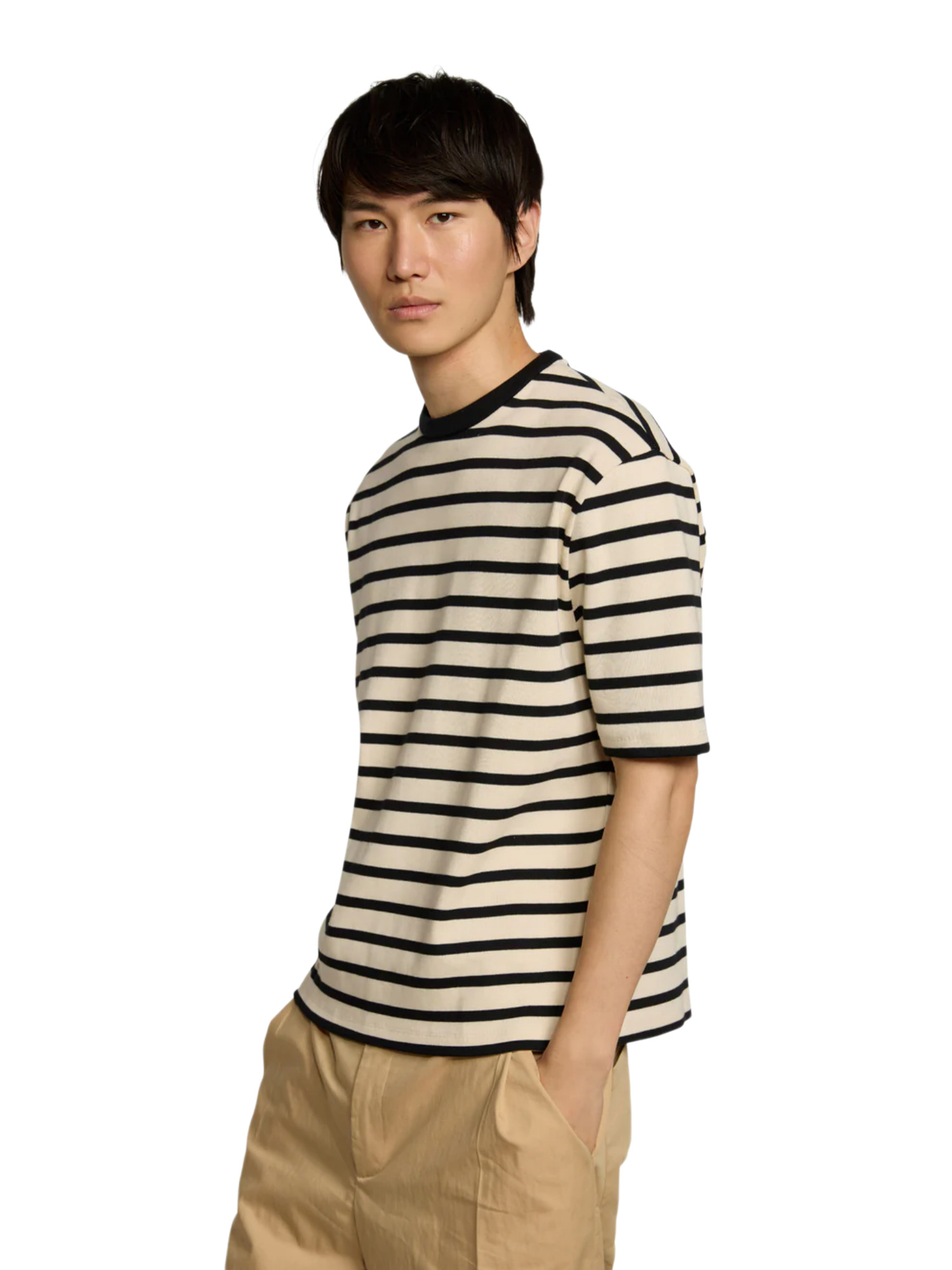 Ein fein ausgearbeiteter Kontrastabschluss am Rundhalsausschnitt setzt einen cleanen Akzent und unterstreicht den durchdachten Charakter des Designs. Die Kombination aus klarem Streifenmuster und maritimem Touch verleiht dem T-Shirt eine frische und zugleich zeitlose Ausstrahlung.
