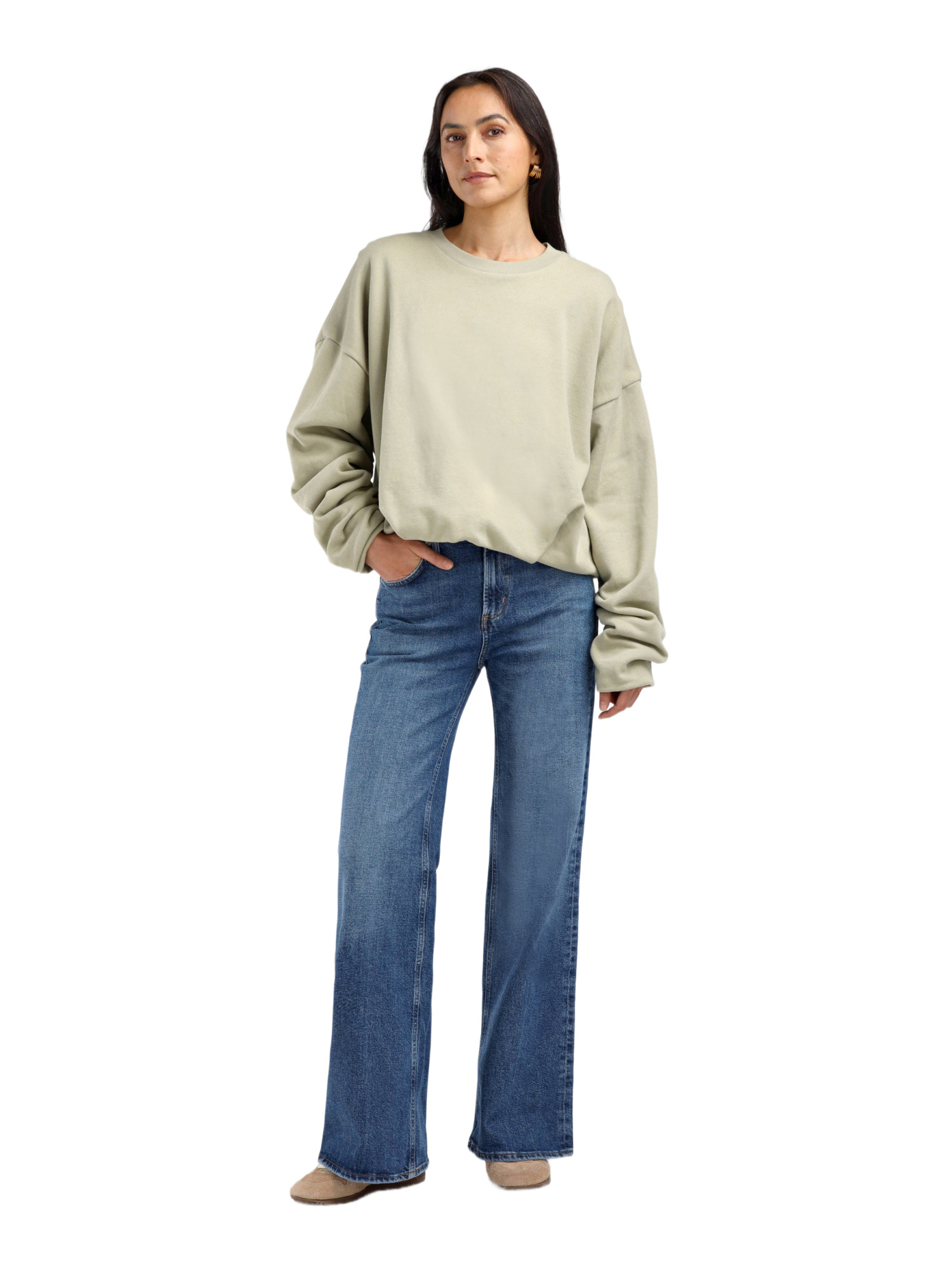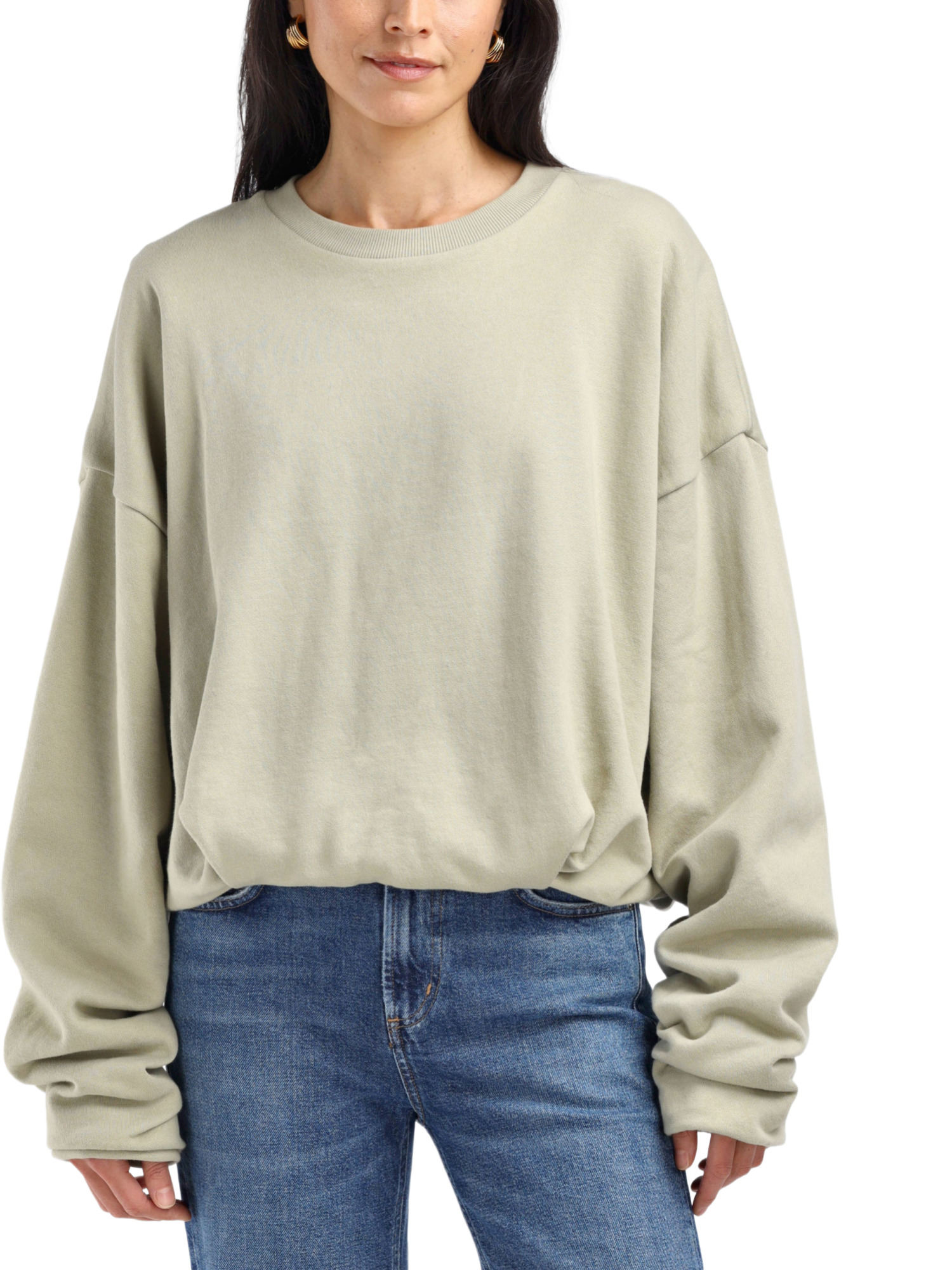 Der gerippte Rundhalsausschnitt bietet nicht nur einen klassischen Look, sondern auch eine bequeme Passform, während die überschnittenen Schultern und gerafften Ärmel in Überlänge dem Sweatshirt eine moderne Note verleihen. Der geraffte, elastische Saum sorgt dafür, dass das Sweatshirt immer perfekt sitzt und nicht verrutscht.