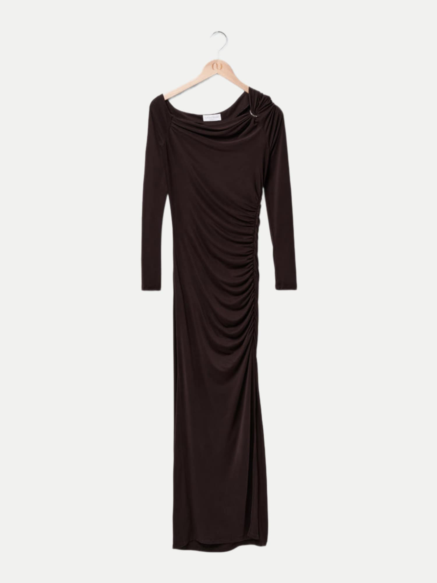 Die markanten Raffungen und der hohe Beinschlitz verleihen dem Kleid eine dynamische Note, während das dezente Metal-Ring-Detail einen Hauch von Luxus hinzufügt. Die extra langen Ärmel sorgen für ein stilvolles und ausgeglichenes Gesamtbild, das sicher alle Blicke auf sich ziehen wird.