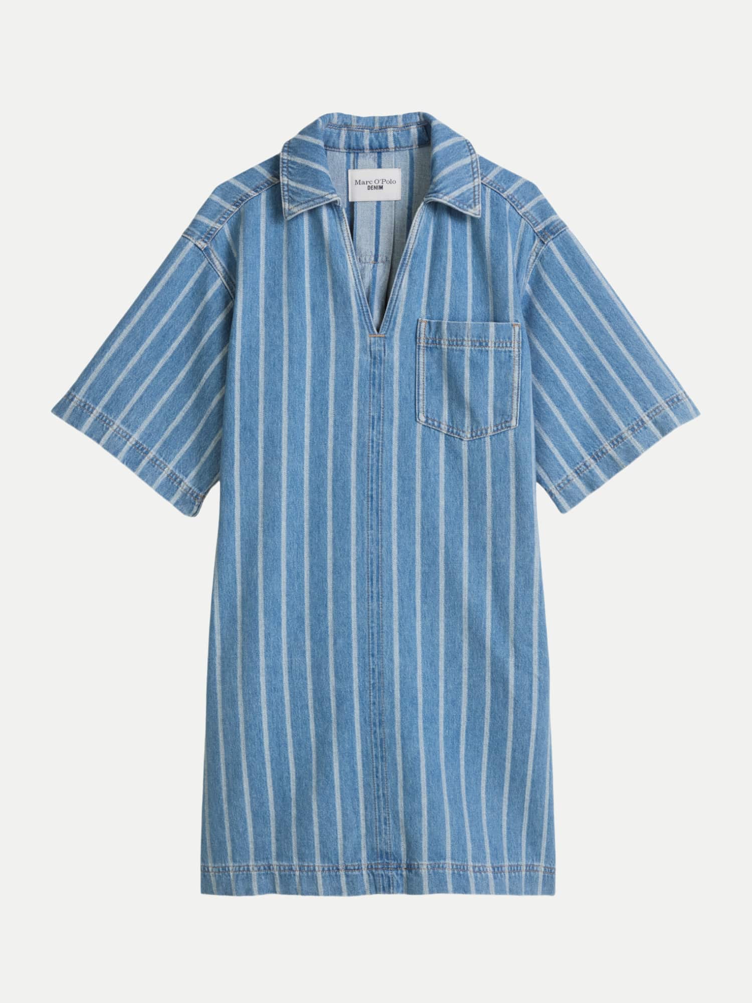 Ein markanter Umlegekragen kombiniert mit einem tiefen, geschlitzten V-Ausschnitt setzt ein modisches Statement und macht das Kleid ideal für sowohl lässige als auch schickere Anlässe. Die unifarbenen, garngefärbten Streifen auf dem weichen Denim-Stoff fügen eine subtile Textur hinzu, die das Kleid sowohl einzigartig als auch vielseitig macht.