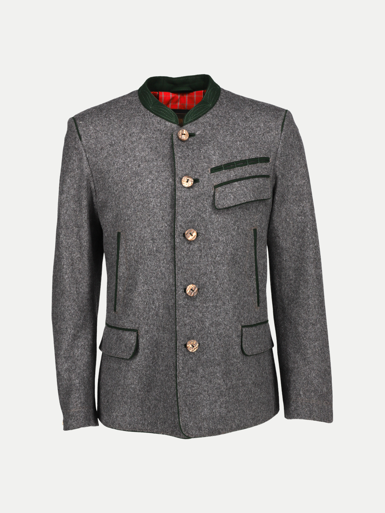 Edler Lodenjanker von Meindl mit rot-kariertem Innenfutter. Die Knöpfe des Jankers bestehen aus echtem Hirschhorn. Der Janker besitzt 2 Außentaschen, 2 Handwärmertaschen, 2 Innentaschen, sowie 1 Brusttasche. Zusätzlich verfügt er über 5 Patronentaschen, die sich oberhalb der Brusttasche befinden. Der Janker wird von einem grünen Fils umrahmt, mit welchem auch der Stehkragen des Jankers eingefasst ist.