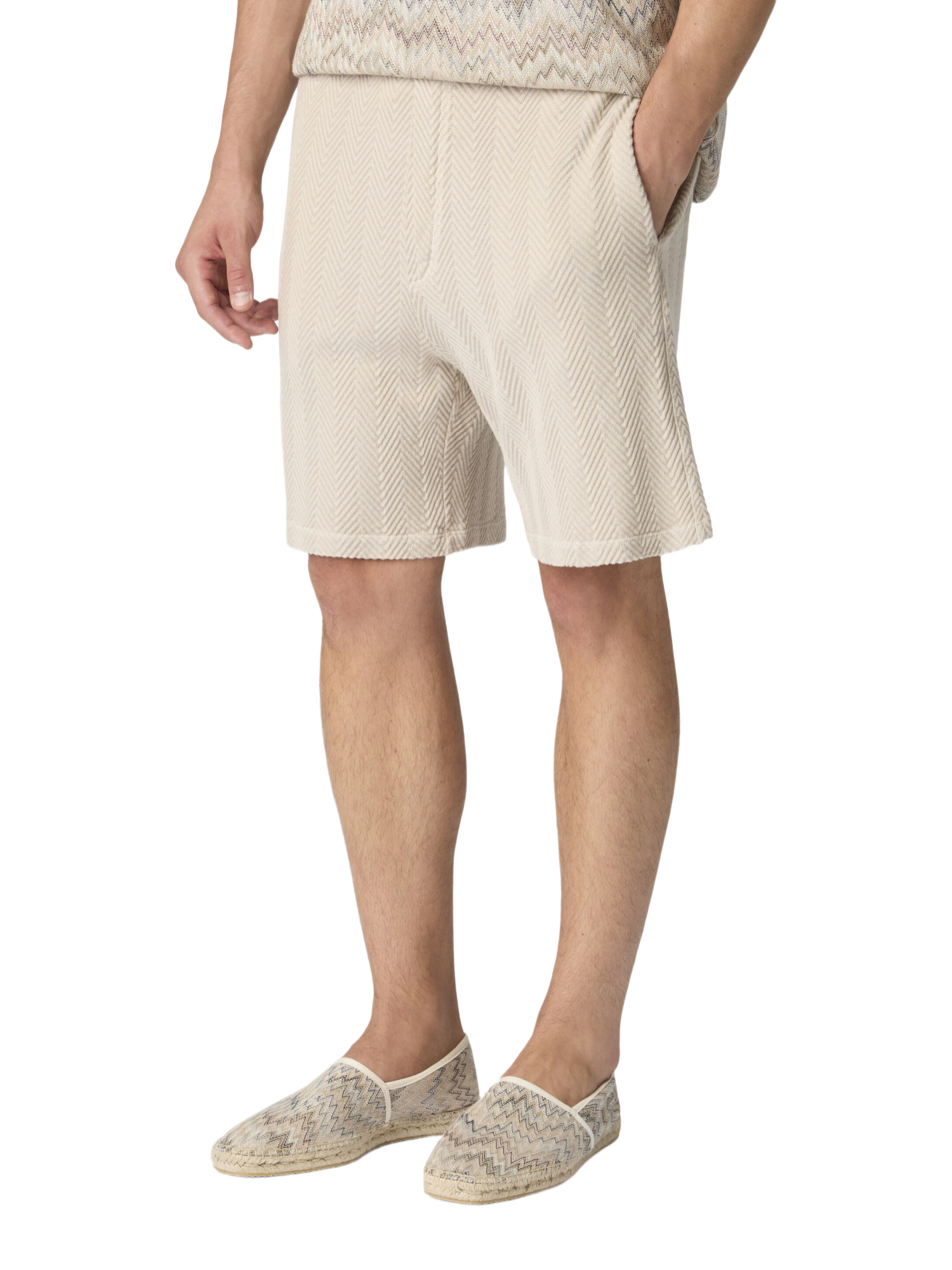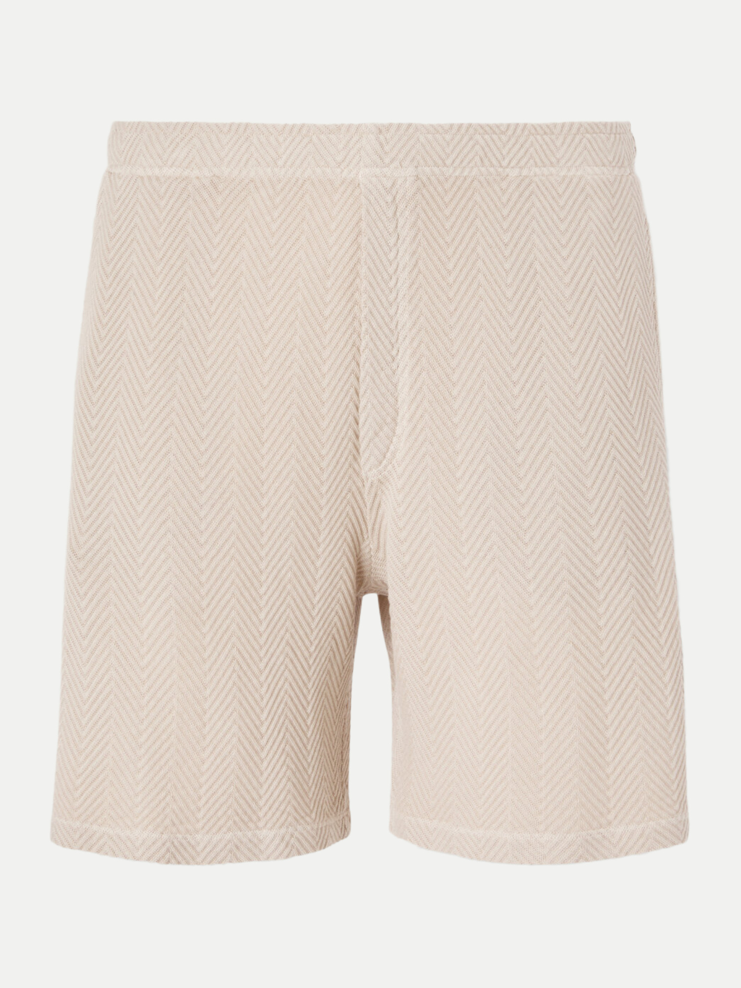 Die Shorts sind aus einem hochwertigen Baumwoll-Viskose-Mix gefertigt, der nicht nur angenehm auf der Haut liegt, sondern auch für eine perfekte Passform sorgt. Das besondere Raschelstrickverfahren verleiht den Shorts ein raffiniertes, tonales Zickzackmuster, das definitiv alle Blicke auf sich ziehen wird.