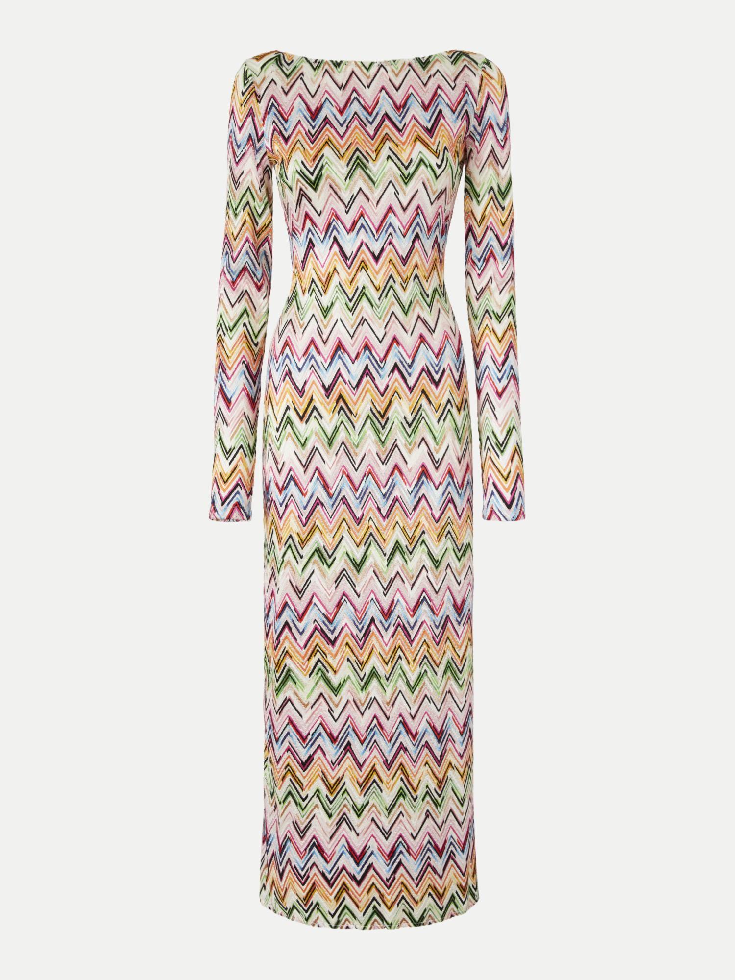 Das MISSONI Strandkleid zeichnet sich durch sein auffälliges Zickzack-Spitzenmuster aus, das nicht nur Blicke auf sich zieht, sondern auch die Silhouette wunderschön umspielt. Die langen Ärmel bieten einen eleganten Kontrast zu dem verführerischen offenen Rücken, der einen Hauch von Sexiness offenbart, ohne zu viel zu zeigen.