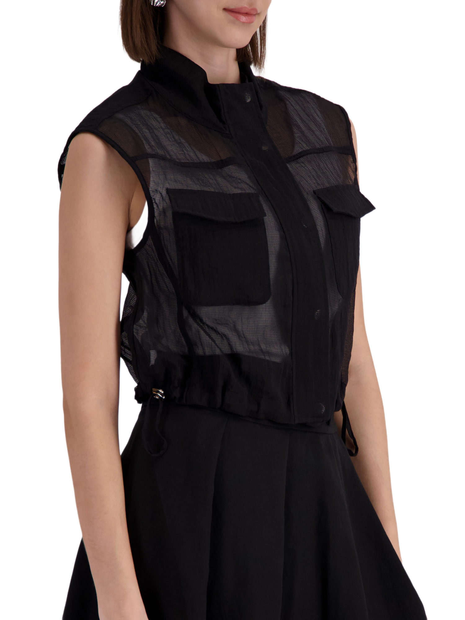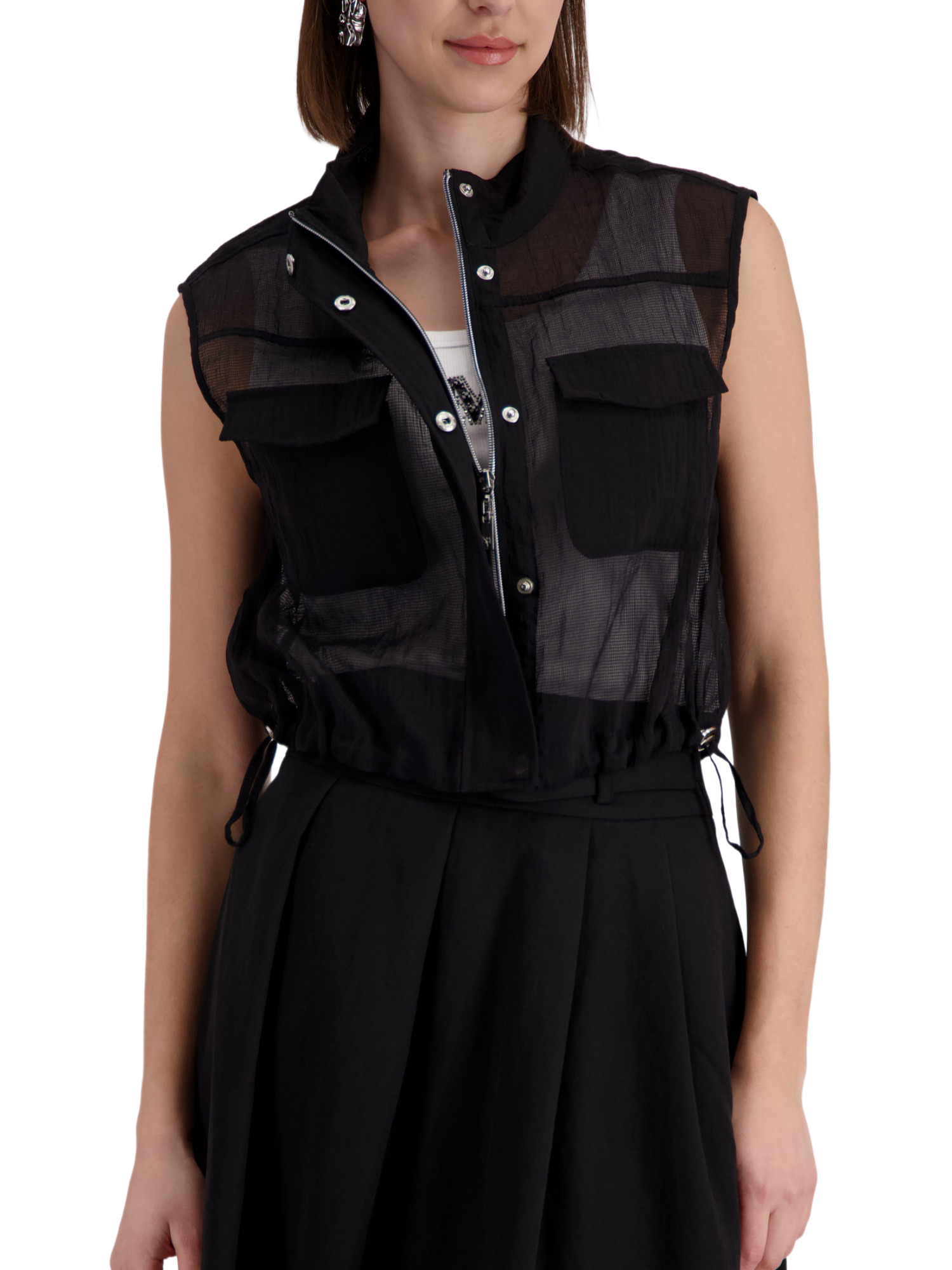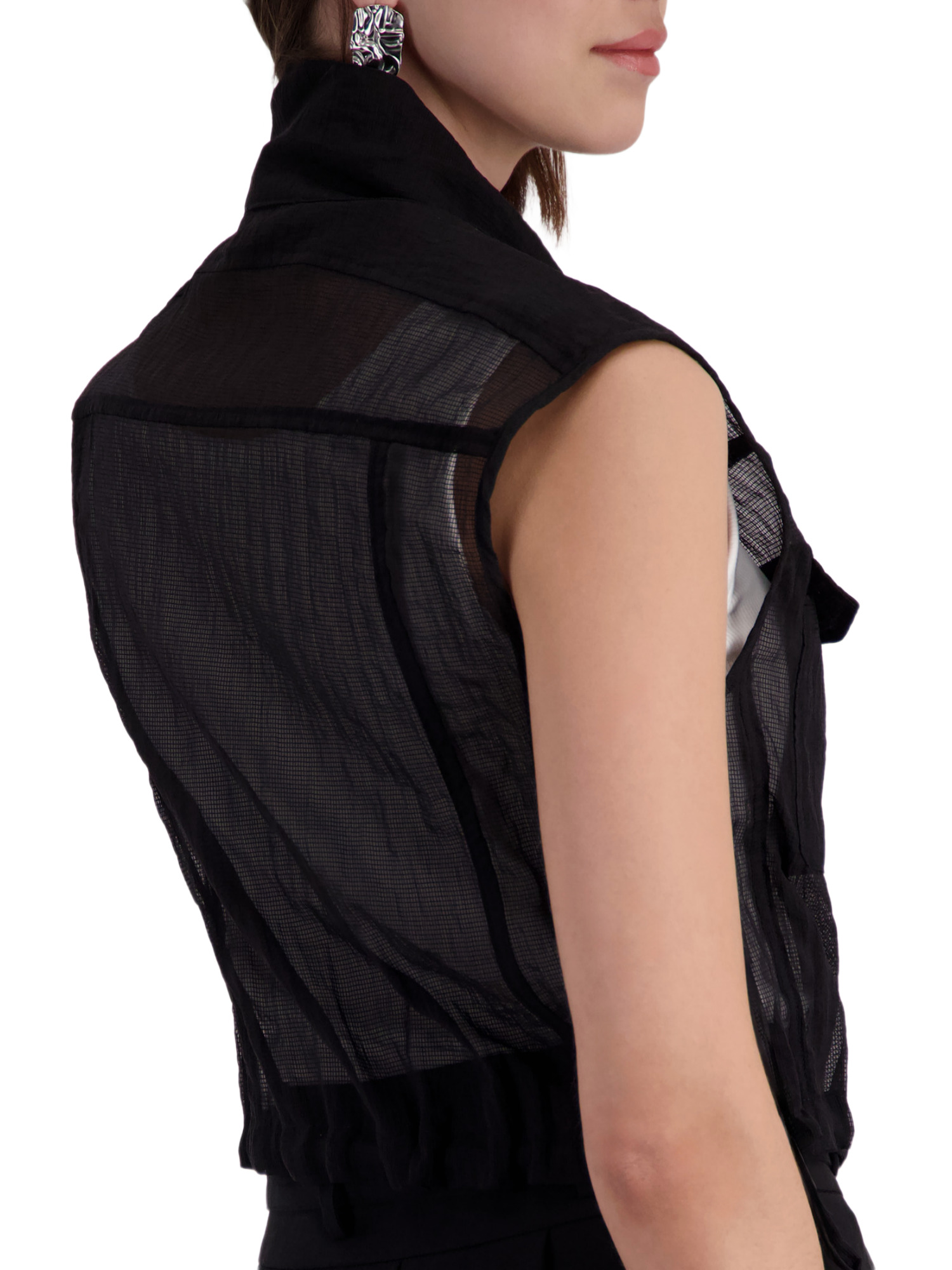 Die Weste zeichnet sich durch einen praktischen Stehkragen aus, der Deinem Look eine elegante Note verleiht. Die Brusttaschen sind nicht nur ein stylisches Detail, sondern bieten auch praktischen Stauraum für kleine Gegenstände. Das charmante Bindeband ermöglicht es Dir, die Passform individuell zu justieren und sorgt für einen Hauch von Verspieltheit.