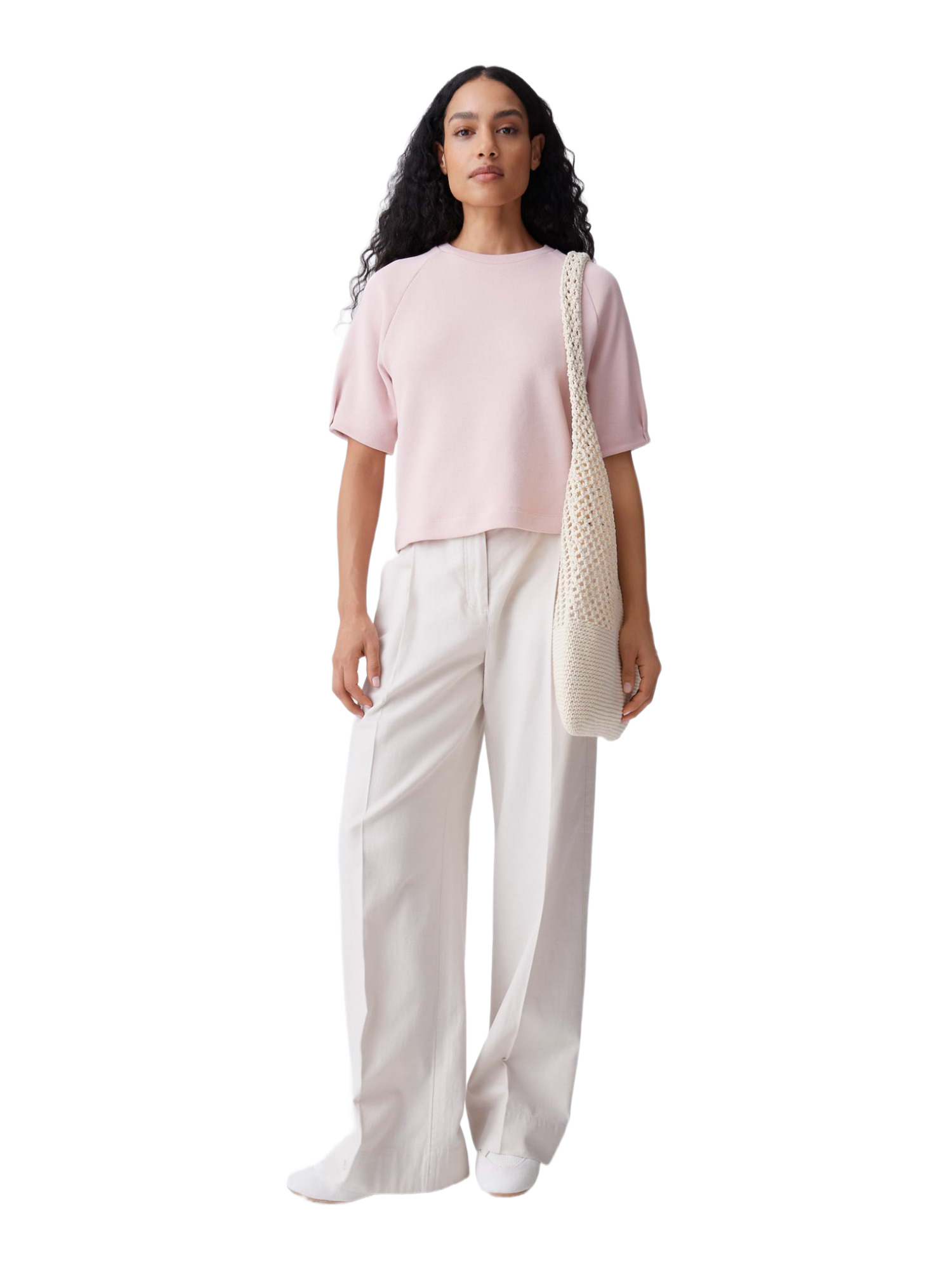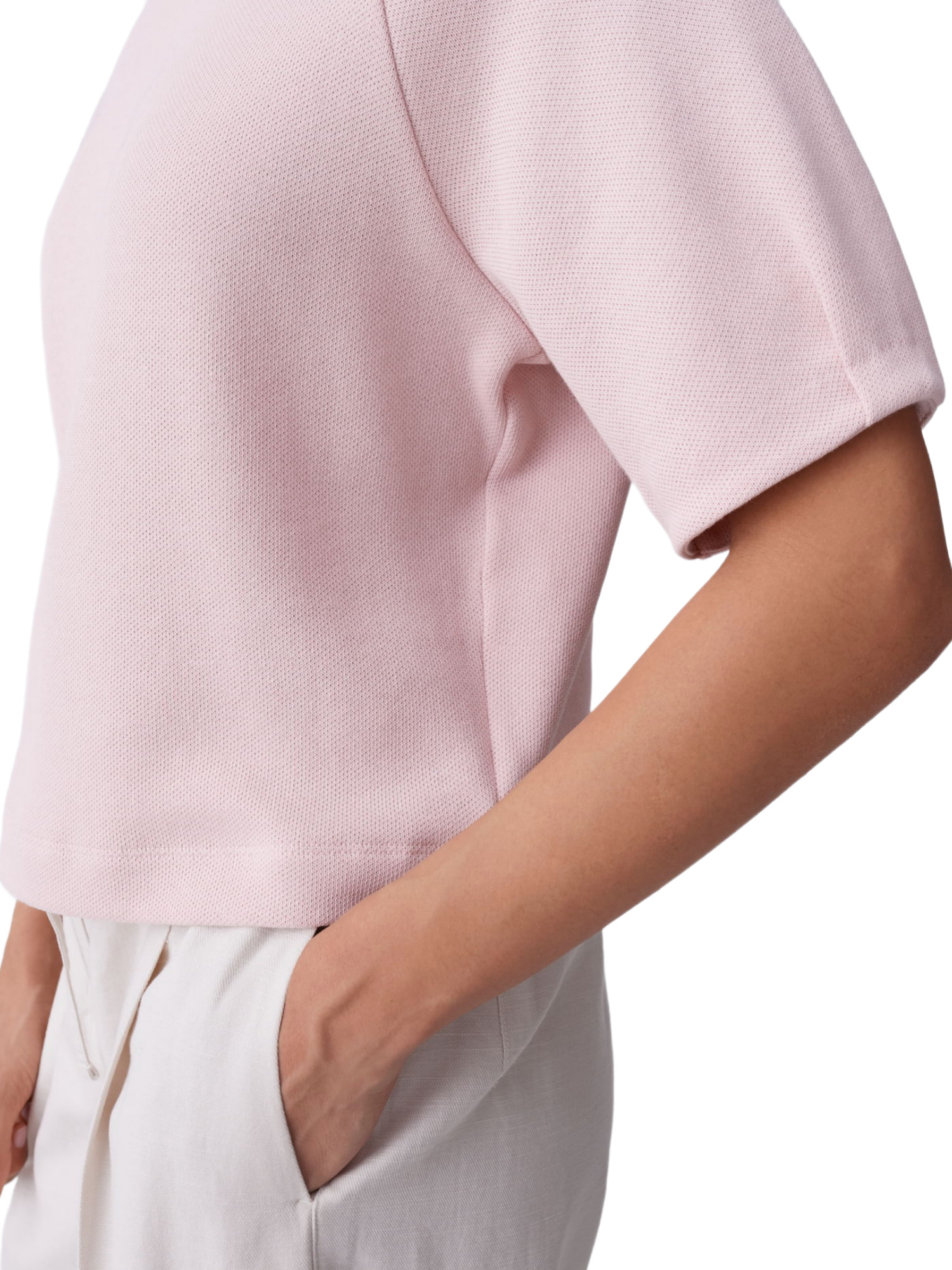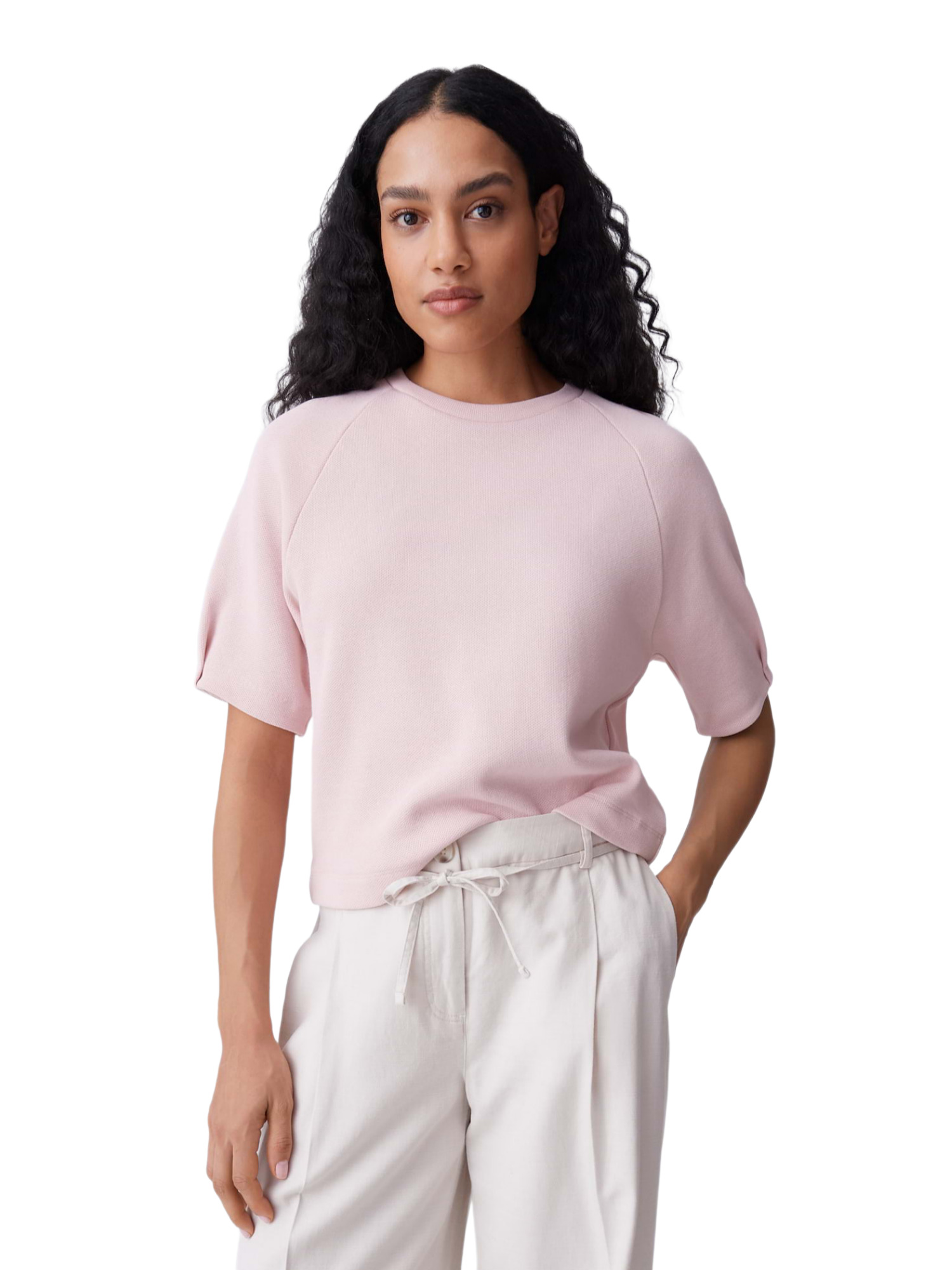 Dieses Sweatshirt ist aus einer hochwertigen Mischung aus 85% Baumwolle und 15% Polyamid gefertigt, was es besonders weich und angenehm auf der Haut macht. Der Rundhalsausschnitt und die Halbarme mit einem charmanten Faltendetail am Ärmelsaum verleihen dem Shirt eine lässige Note. Die Piqué-Optik sorgt für eine interessante Textur, die das Unifarbene Design gekonnt aufbricht.