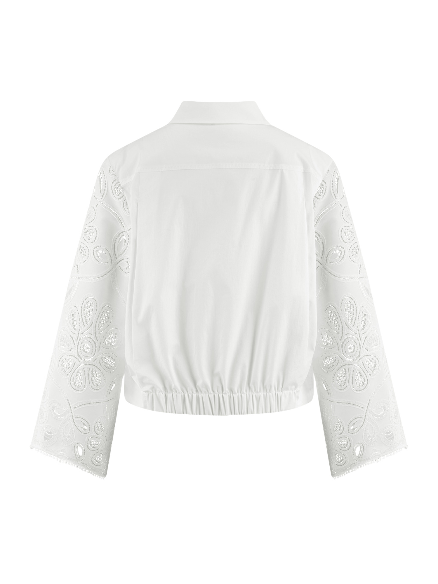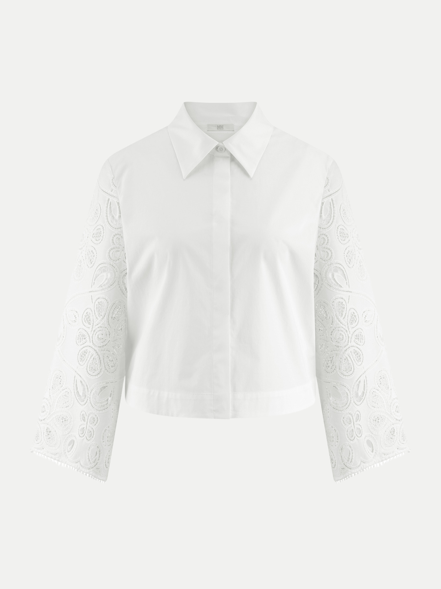 Diese Bluse zeichnet sich durch ihre ausgestellten Ärmel mit filigranen Stickereien aus, die jedem Outfit eine besondere Note verleihen. Der Button-Down-Kragen fügt eine klassische Komponente hinzu, während der klare Schnitt der Bluse eine moderne Silhouette schafft. Ob im Büro oder beim entspannten Stadtbummel, mit dieser Bluse ziehst Du die Blicke auf Dich.