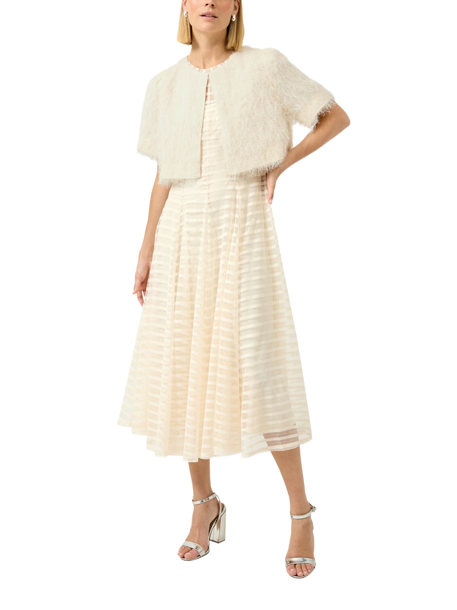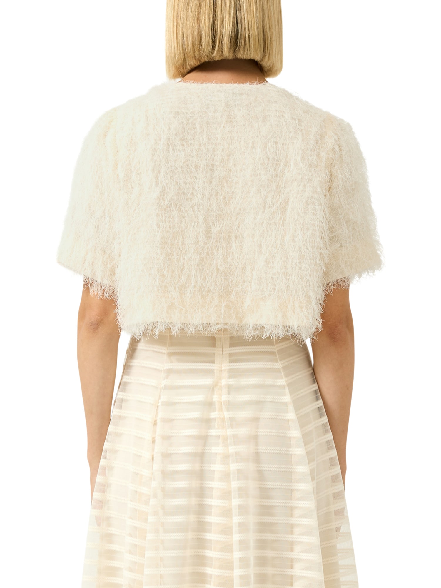 Die Jacke ist aus 100% hochwertigem Polyester gefertigt, sowohl außen als auch im Futter, was sie besonders angenehm zu tragen macht. Das Kunstfell fühlt sich weich und luxuriös an, perfekt für kühle Tage. Der Rundhalskragen verleiht einen klassischen Touch, während die kurzen Ärmel und die cropped Länge der Jacke eine moderne und jugendliche Ausstrahlung geben.
