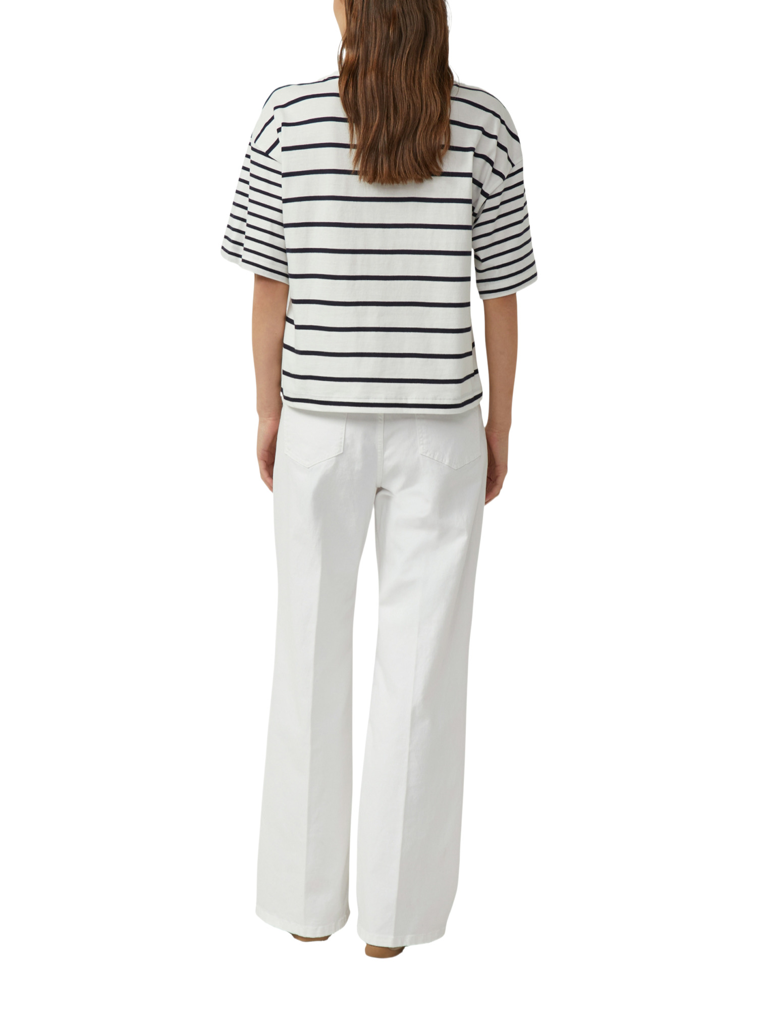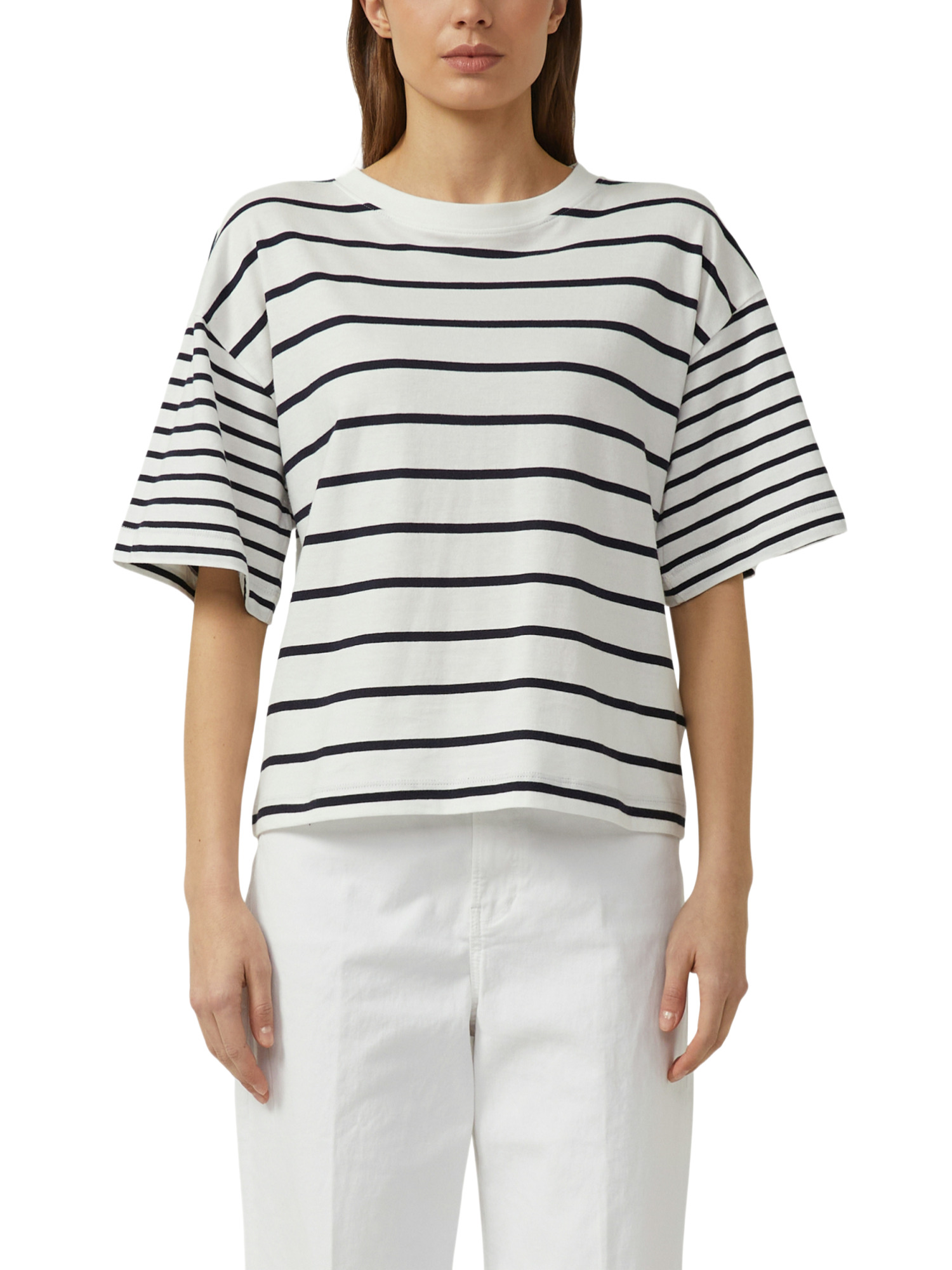 Das gestreifte Muster verleiht dem T-Shirt eine zeitlose Note, die nie aus der Mode kommt. Kombiniere es mit Jeans für einen lässigen Look oder mit einer schicken Hose für einen eleganteren Anlass. Der Rundhalsausschnitt mit Rippblende fügt eine feine, modische Nuance hinzu, die das Gesamtbild abrundet.