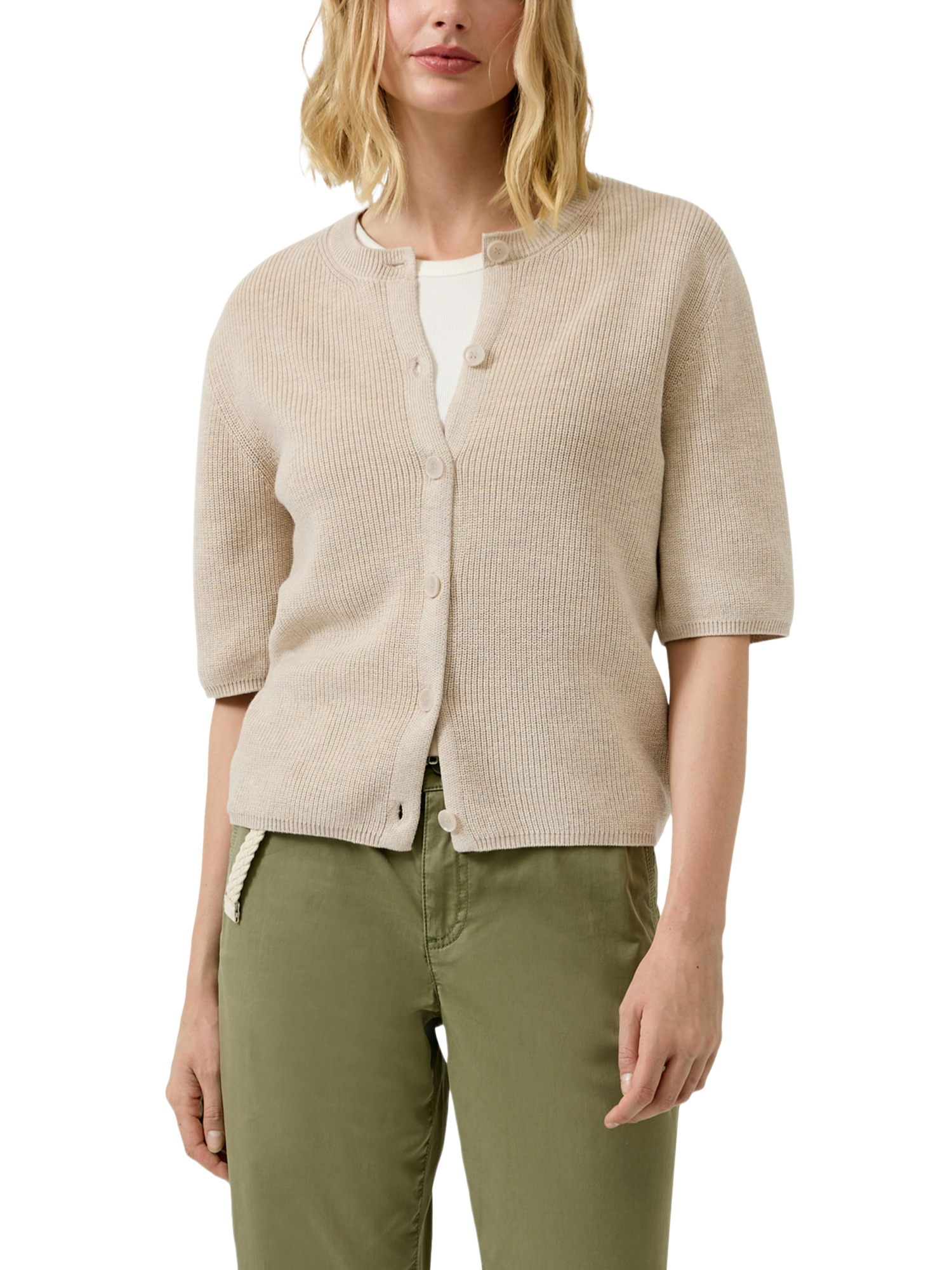 Diese Halbarm-Strickjacke ist der ideale Begleiter für jeden Casual-Look. Ob über einem schicken Top zu einer Jeans oder als eleganter Überwurf über ein Kleid – die Möglichkeiten sind endlos. Die praktische Knopfleiste ermöglicht ein schnelles An- und Ausziehen, während der Rundhalsausschnitt deinem Outfit eine feine Note verleiht.