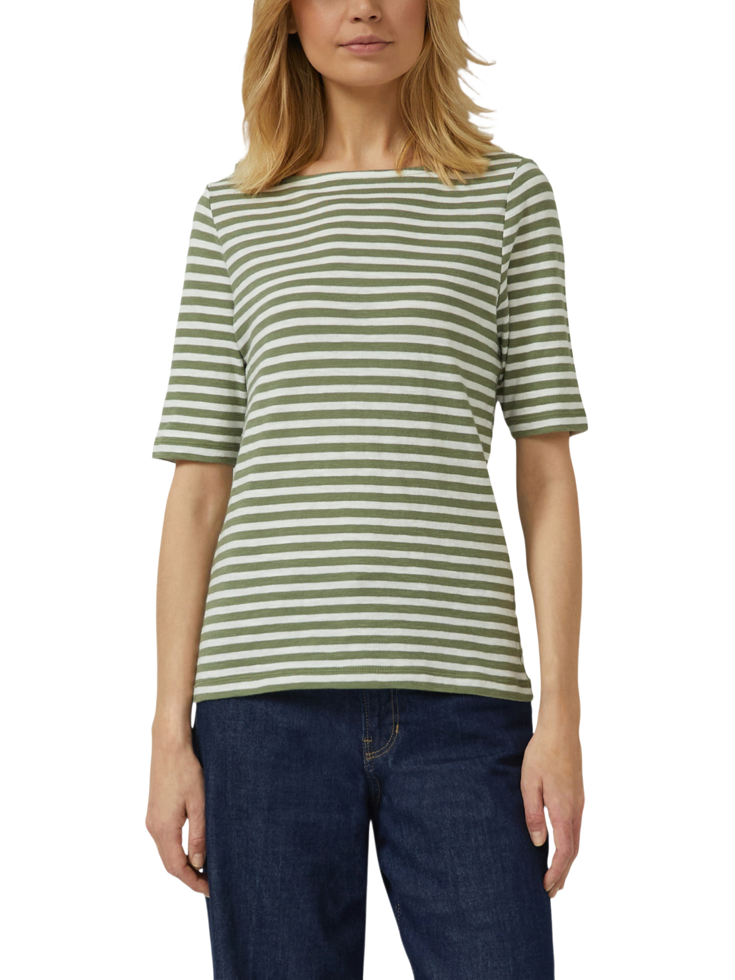 Das gestreifte Halbarmshirt zeichnet sich durch seinen Slim Fit aus, der Deine Figur sanft umschmeichelt, ohne einzuengen. Der U-Boot-Ausschnitt verleiht dem Shirt eine feminine Note, während das Flammgarn dem Stoff eine interessante Textur gibt. Ob für einen entspannten Tag zu Hause oder einen spontanen Stadtbummel, dieses T-Shirt ist Dein idealer Begleiter.