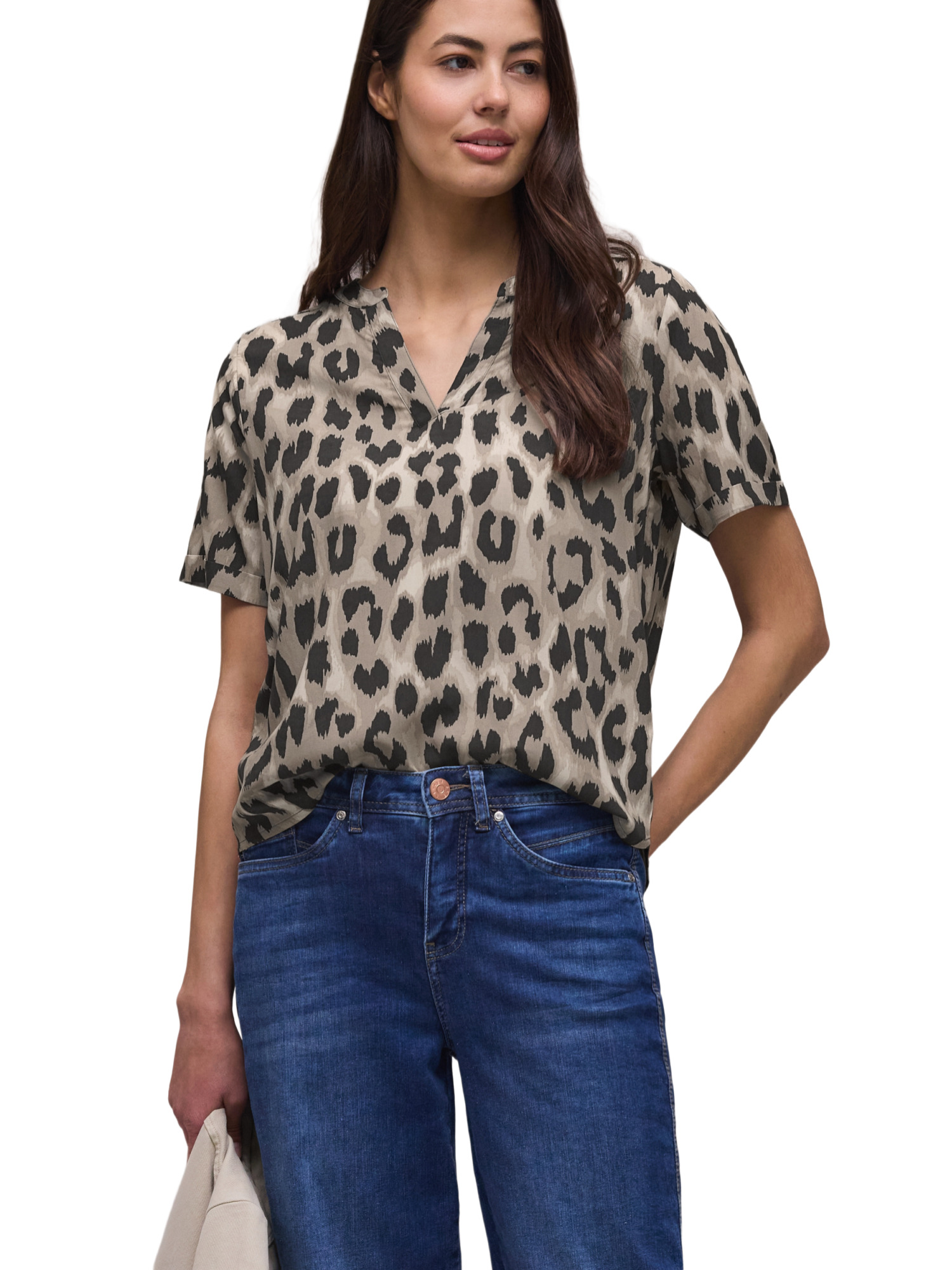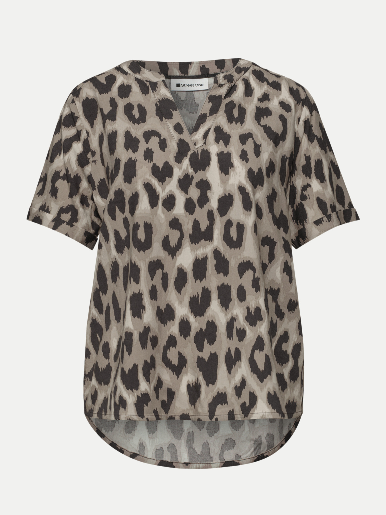 Der trendige Animalprint macht das Shirt zu einem vielseitigen Partner für zahlreiche Outfits. Ob zur Jeans für einen entspannten Tag in der Stadt oder zu einem eleganten Rock für das Büro – dieses Blusenshirt lässt sich wunderbar kombinieren. Der Split Neck und die kurzen Ärmel verleihen dem Shirt einen lässigen, aber dennoch schicken Look, der Deine feminine Seite perfekt unterstreicht.