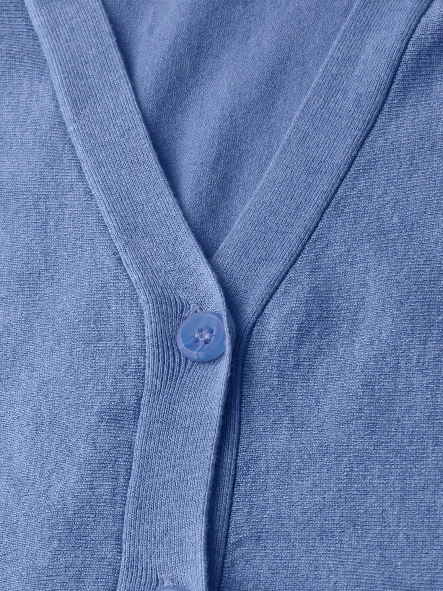 Der klassische V-Ausschnitt und die praktische Knopfleiste machen diese Jacke zu einem echten Hingucker. Die 3/4-Ärmel und die feinen Rippdetails an Bund und Bündchen verleihen dem Stück eine feminine Note und sorgen dafür, dass du immer top gestylt bist, egal ob im Büro oder beim entspannten Stadtbummel.