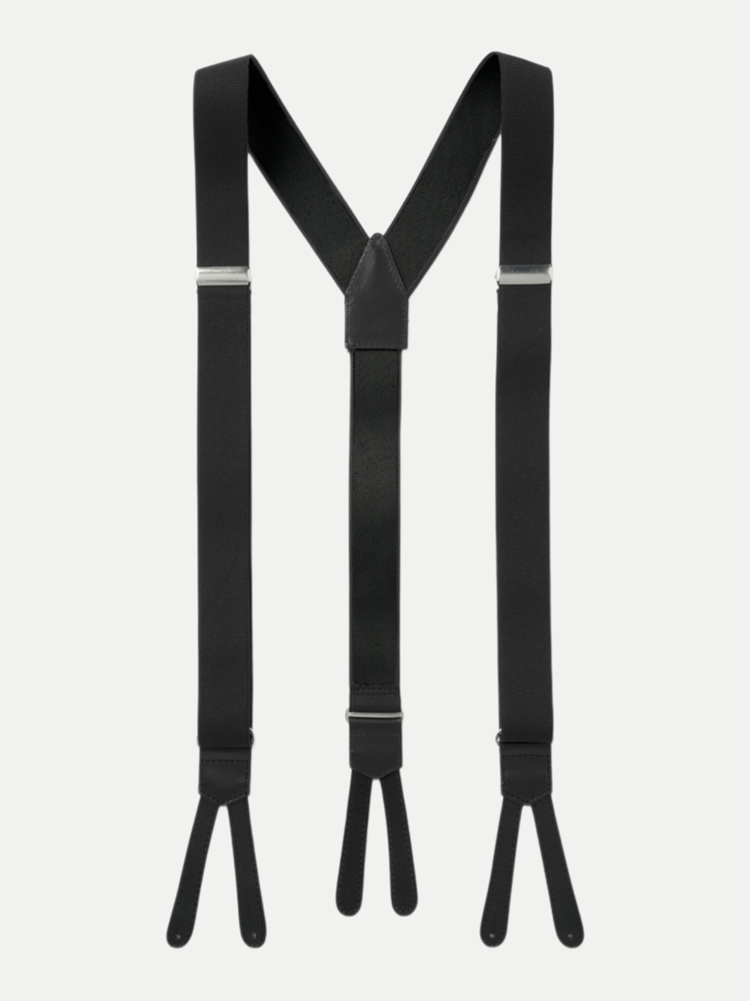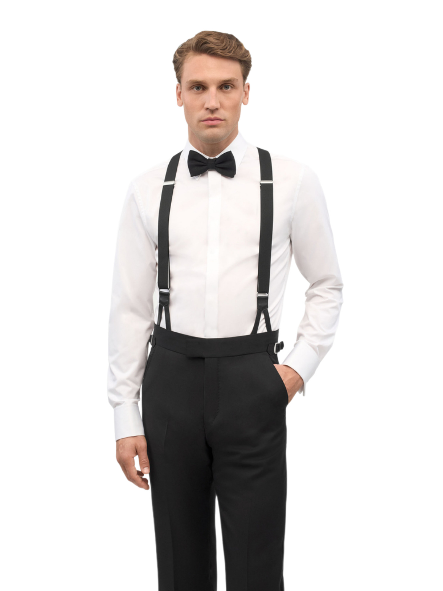 Die schwarzen Hosenträger kommen in einem schlichten, unifarbenen Design, das sich mühelos in Deine Garderobe integrieren lässt. Verziert mit stilvollen Silberdetails, bieten sie einen Hauch von Luxus. Ob zu einem formellen Anlass oder als Teil Deines Business-Outfits, diese Hosenträger heben Deinen Stil hervor und passen perfekt zu unserem SSP-Smoking.