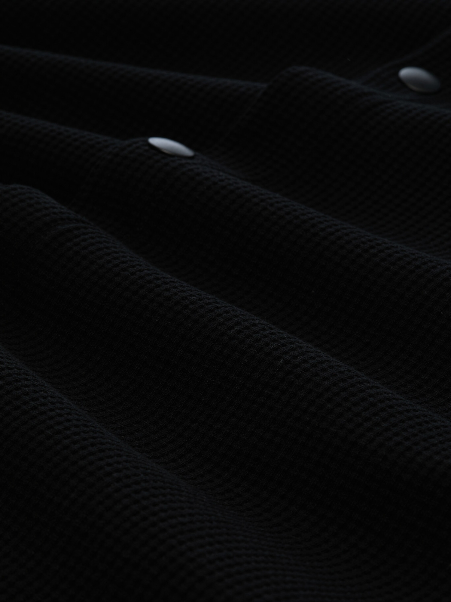 Die Hemdjacke zeichnet sich durch eine praktische Druckknopfleiste und elastische Gummibünde an den Ärmelsäumen aus, die nicht nur für eine optimale Passform sorgen, sondern auch das An- und Ausziehen erleichtern. Der strukturierte Stoff in Waffel-Optik verleiht der Jacke eine interessante Textur, die sofort ins Auge fällt.