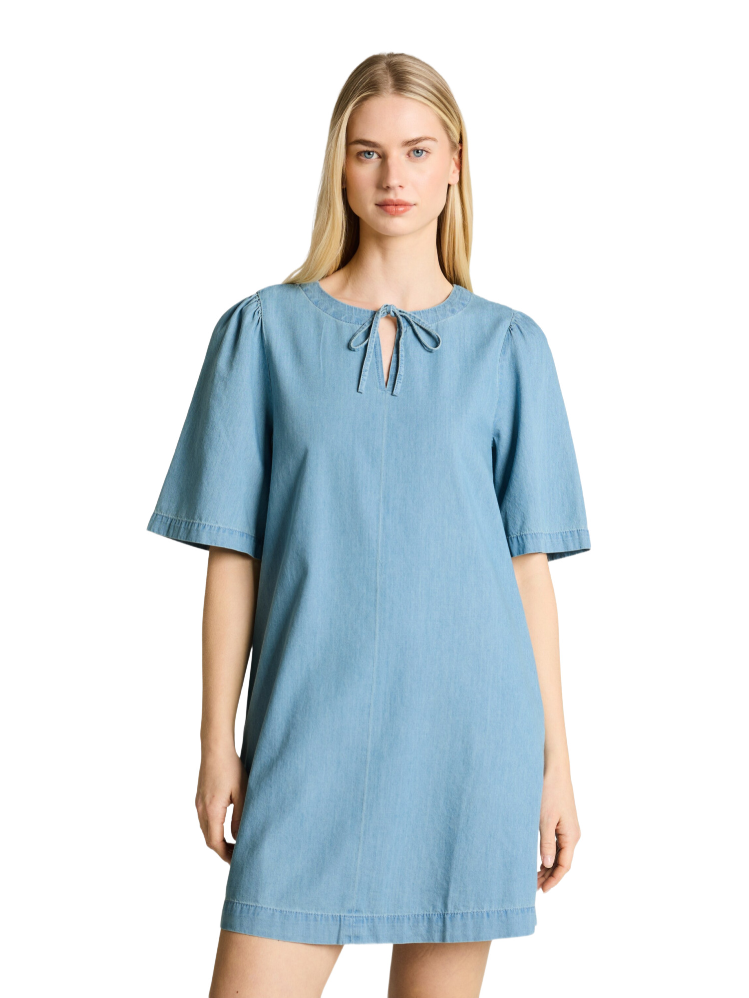 Die leichten Raffungen an den Schultern verleihen eine feminine Note, während der Schleifenkragen und das Bindeband am Ausschnitt dem Design eine verspielte und zugleich elegante Komponente hinzufügen. Ob Du es zu einem entspannten Nachmittag im Café oder zu einem spontanen Stadtbummel trägst, dieses Kleid passt sich jeder Situation mühelos an.