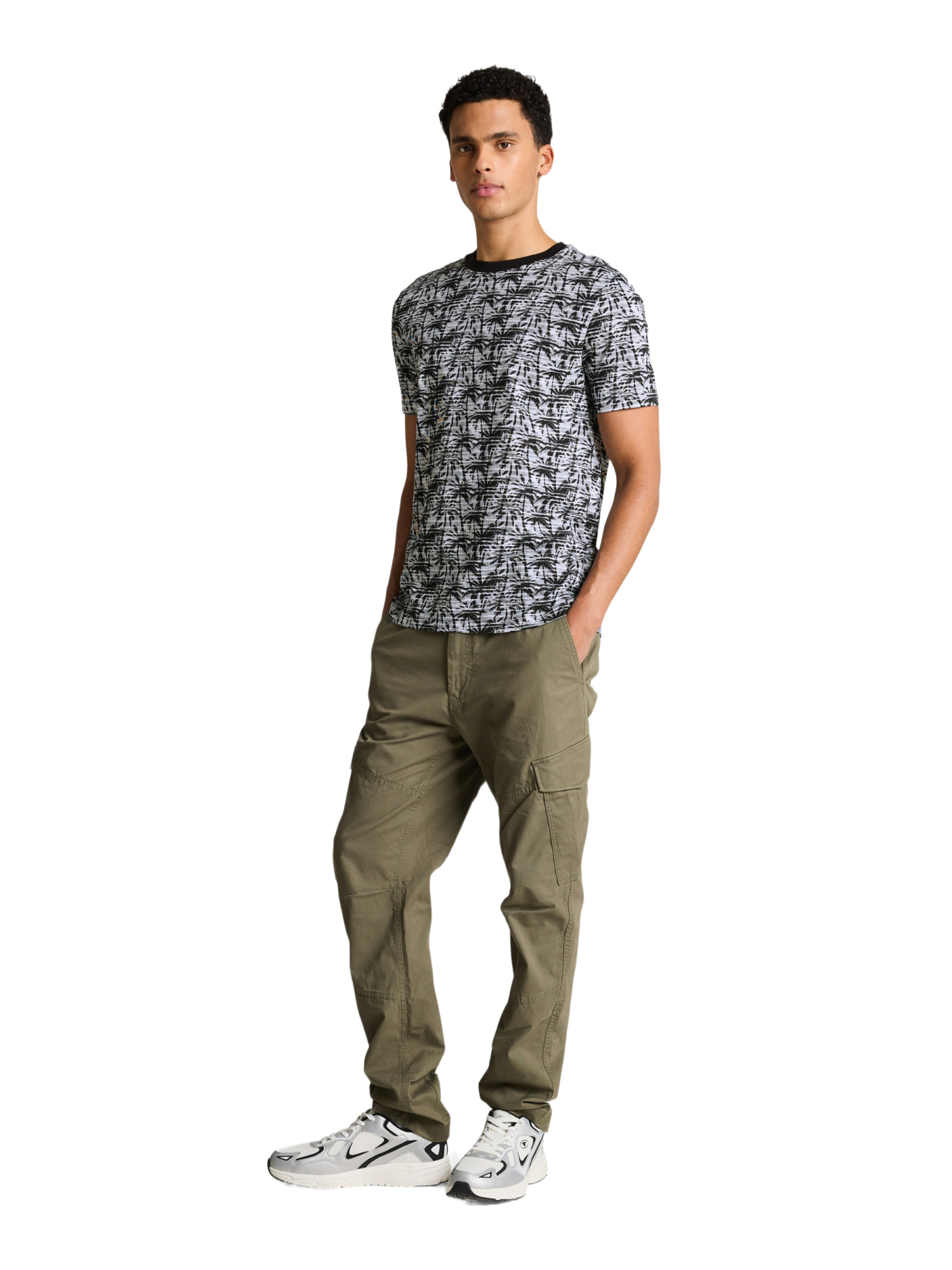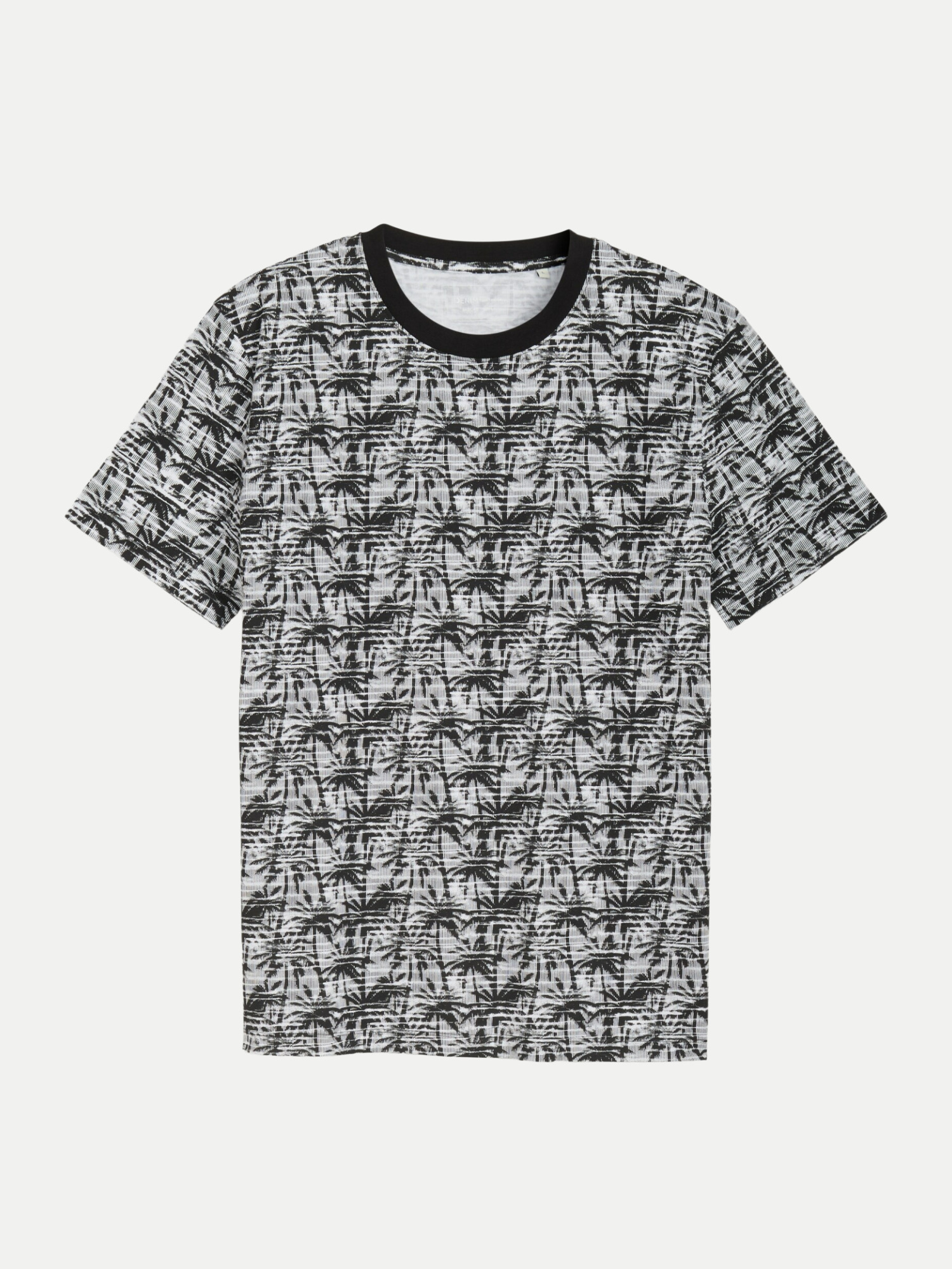 Der Allover-Print mit Palmen verleiht dem Shirt einen lässigen, aber dennoch markanten Look. Der klassische Rundhalskragen und die kurzen Ärmel unterstreichen den entspannten Charakter des Shirts. Kombiniere es mit deiner Lieblingsjeans oder einer leichten Sommerhose für einen mühelosen Casual-Look.