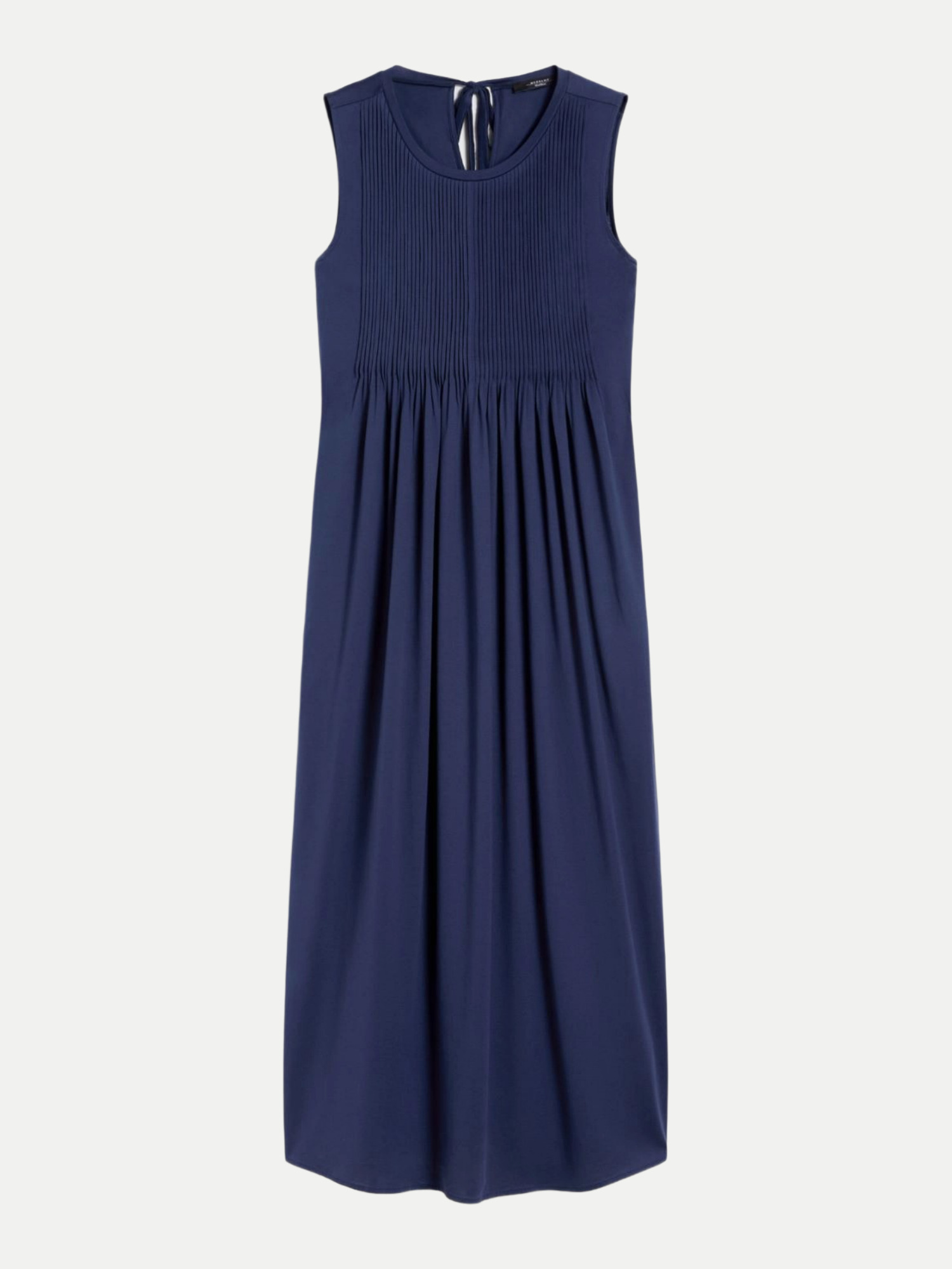Das besondere Highlight des Kleides ist das plissierte Motiv auf der Vorderseite, das dem Kleid Bewegung und Volumen verleiht. Der Rundhalsausschnitt und die breiten Schulterträger sorgen für einen modernen und zugleich zeitlosen Look. Zudem bietet die Rückseite eine raffinierte Tränenöffnung mit Selbstbindung am Nacken, die einen Hauch von Raffinesse hinzufügt.