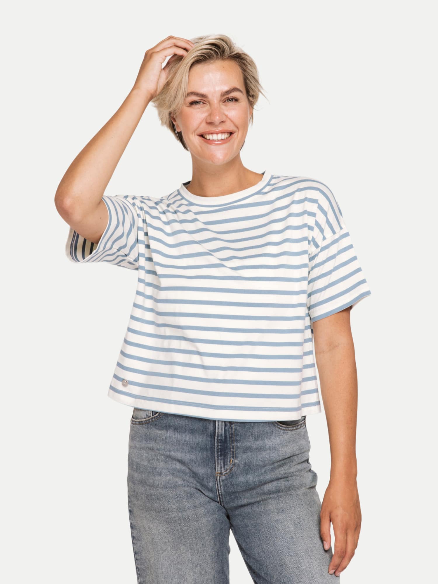 Der Rundhalsausschnitt verleiht eine klassische Note, während die überschnittenen Schultern und weiten, kurzen Ärmel dem Design eine moderne Lässigkeit verleihen. Der gerade, verkürzte Saum bietet zudem einen trendigen Twist, der super zu High-Waist Jeans oder Röcken aussieht.