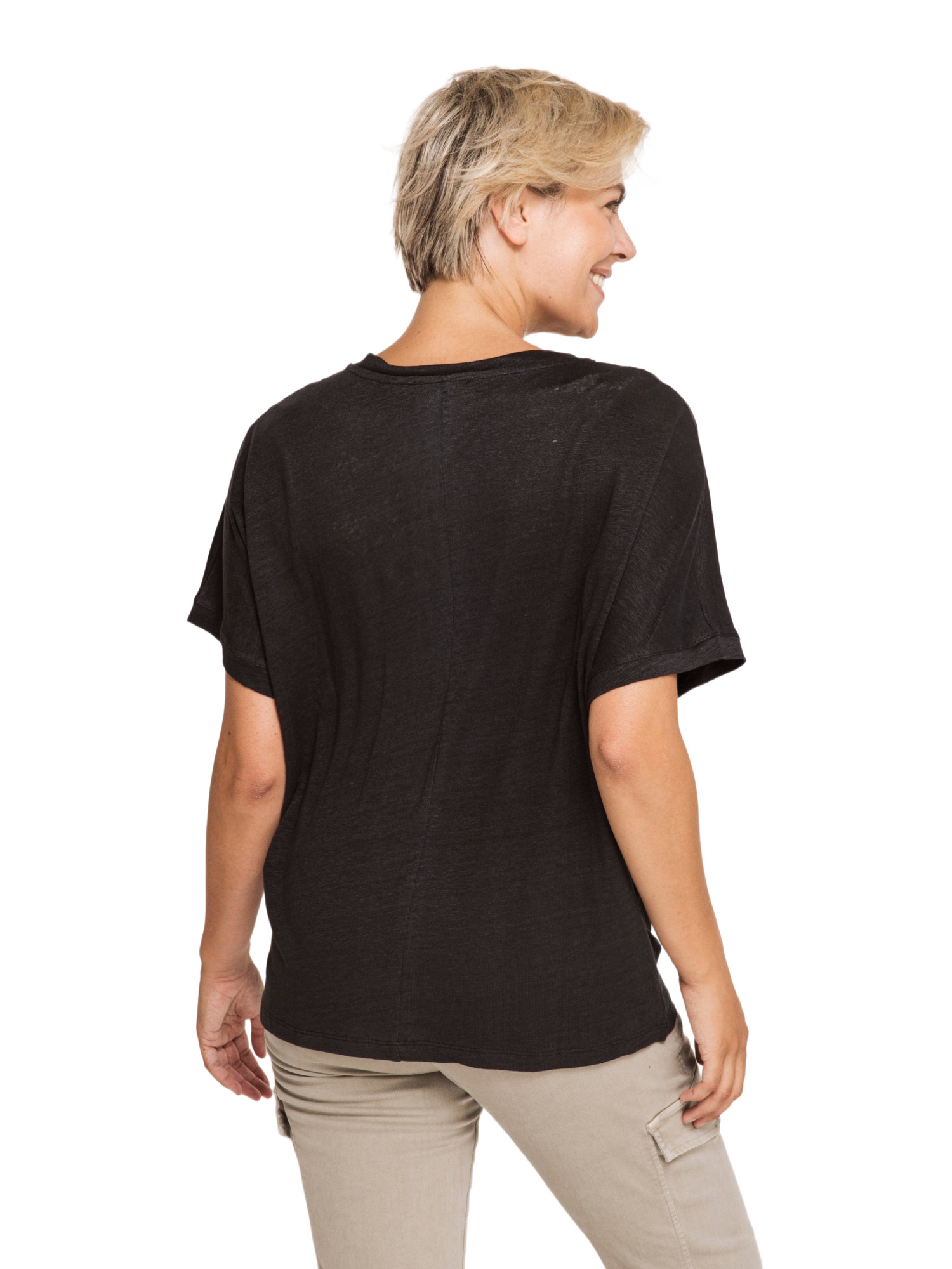 Kombiniere das T-Shirt mit Jeans und Sneakers für einen casual Look oder trage es unter einem Blazer, um es bürotauglich zu machen. Schwarz ist unglaublich vielseitig und lässt sich leicht mit verschiedenen Farben und Mustern kombinieren.